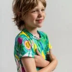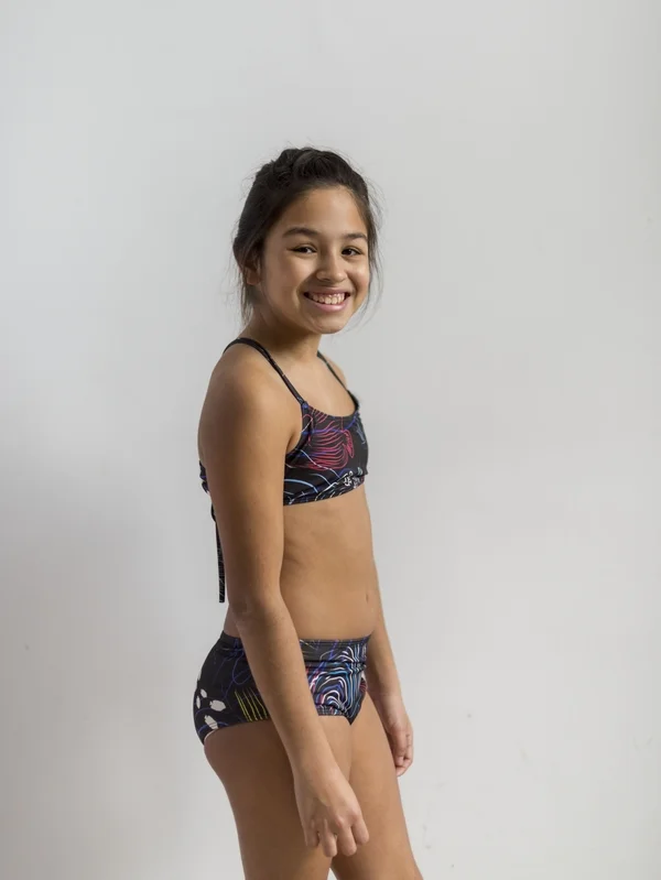 Bikini Nena. Corpiño regulable con breteles para atar que se pueden usar rectos o cruzados. – Estampa con base negra/gris oscuro inspirada en el mundo submarino, los peces angel, especialmente en el pez angel emperador. Las prendas reversibles son combinadas con negro.