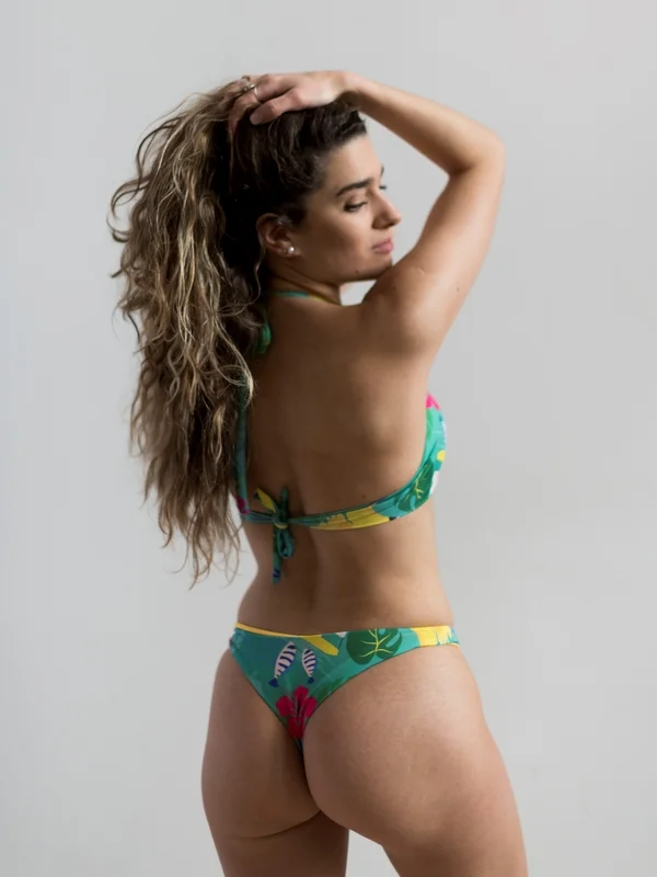 Cola less reversible. Corte clasico, tiro medio (Observacion: las prendas reversibles son un poco mas amplias y ajustan menos que las que no lo son) – Inspirada en Ilha Grande y la historia de Coni y Juan de @el_barco_amarillo navegando allí. Base color verde, con flores y frutas tropicales, amarillo, fucsia y más colores. Las prendas reversibles están combinadas con amarillo.