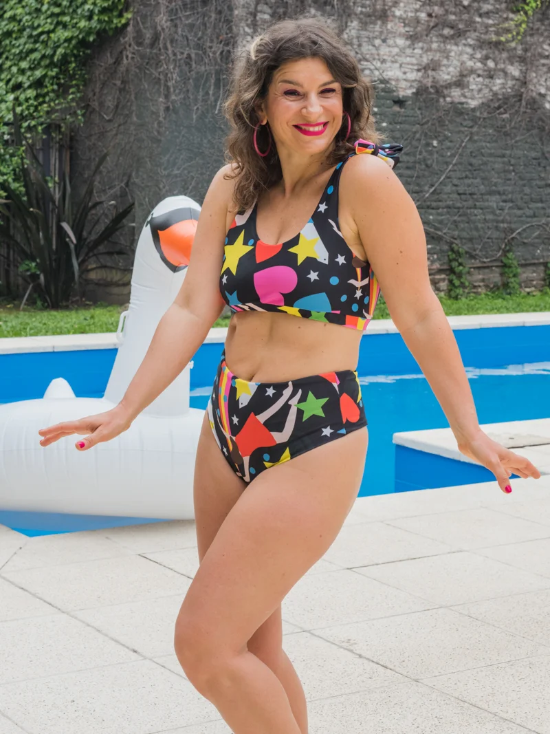 Cola less / Culotte less tiro alto reversible (al ombligo aprox). (Observacion: las prendas reversibles son un poco mas amplias y ajustan menos) – Estampa multicolor, con base negra, que refleja la magia y las risas de Dalia sobre el escenario de Buenos Aires. Obelisco, microfono, ella bailando, rodeada de luces, estrellas y corazones. Realizada con la colaboracion de Dalia @daliagutmann, inspirada en su trabajo de comediante y artista. (Observacion: las prendas reversibles son con negro – Monte)