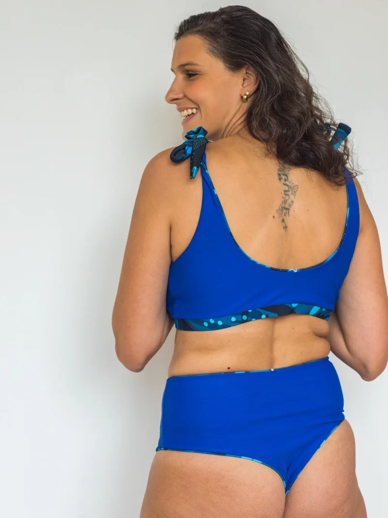 Cola less / Culotte less tiro alto reversible (al ombligo aprox). (Observacion: las prendas reversibles son un poco mas amplias y ajustan menos) – Estampa en tonos azules con tiburones y manta rayas. Inspirada en @gadormunta, su vida como oceanografa y cientifica marina especialista en tiburones y sus inmersiones en el oceano pacifico especialmente en la zona de Baja California. (Observacion: las prendas reversibles son con azul – Santorini)