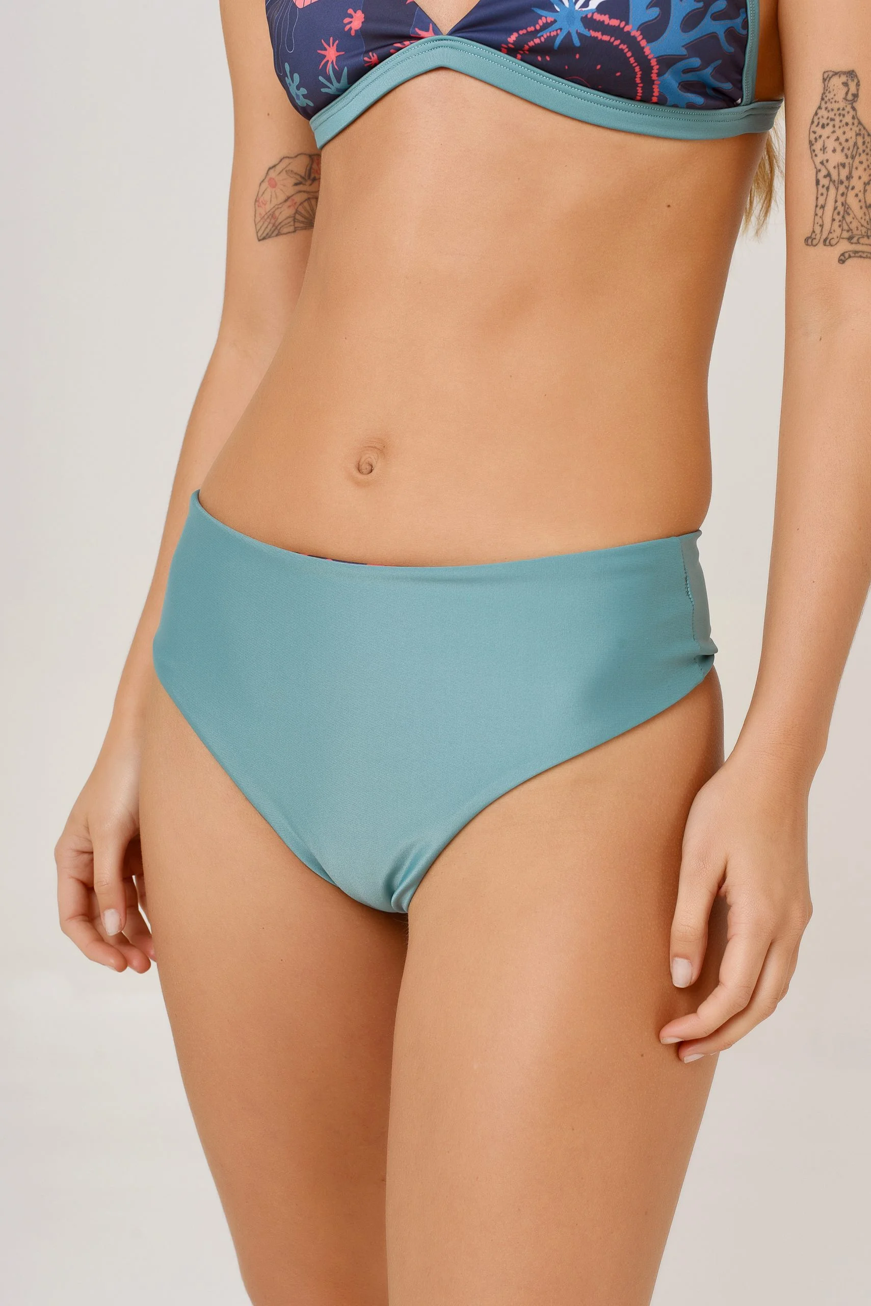 Cola less / Culotte less tiro alto intermedio reversible (dos dedos abajo del ombligo aprox). Calce perfecto! – Estampa inspitada en corales y el fondo marino. Combinada/reversible con verde transformative teal. Referencia: Ema altura 1.74, medidas 84/65/90 y luce en la foto el talle 1