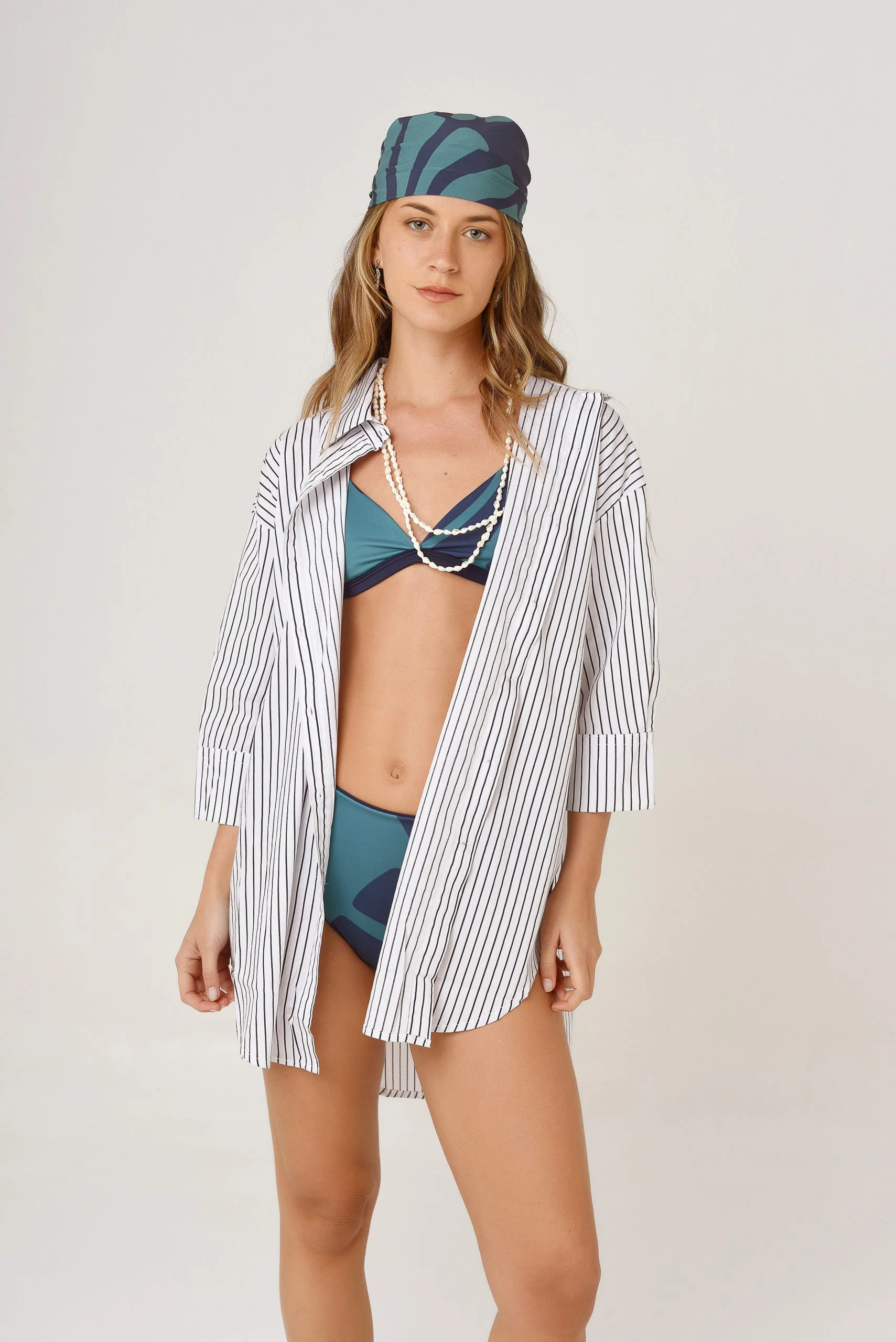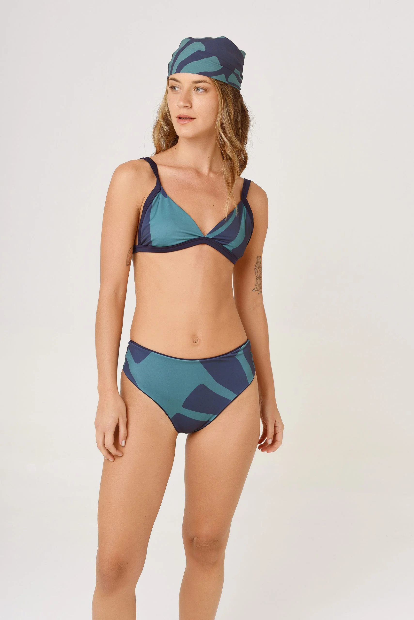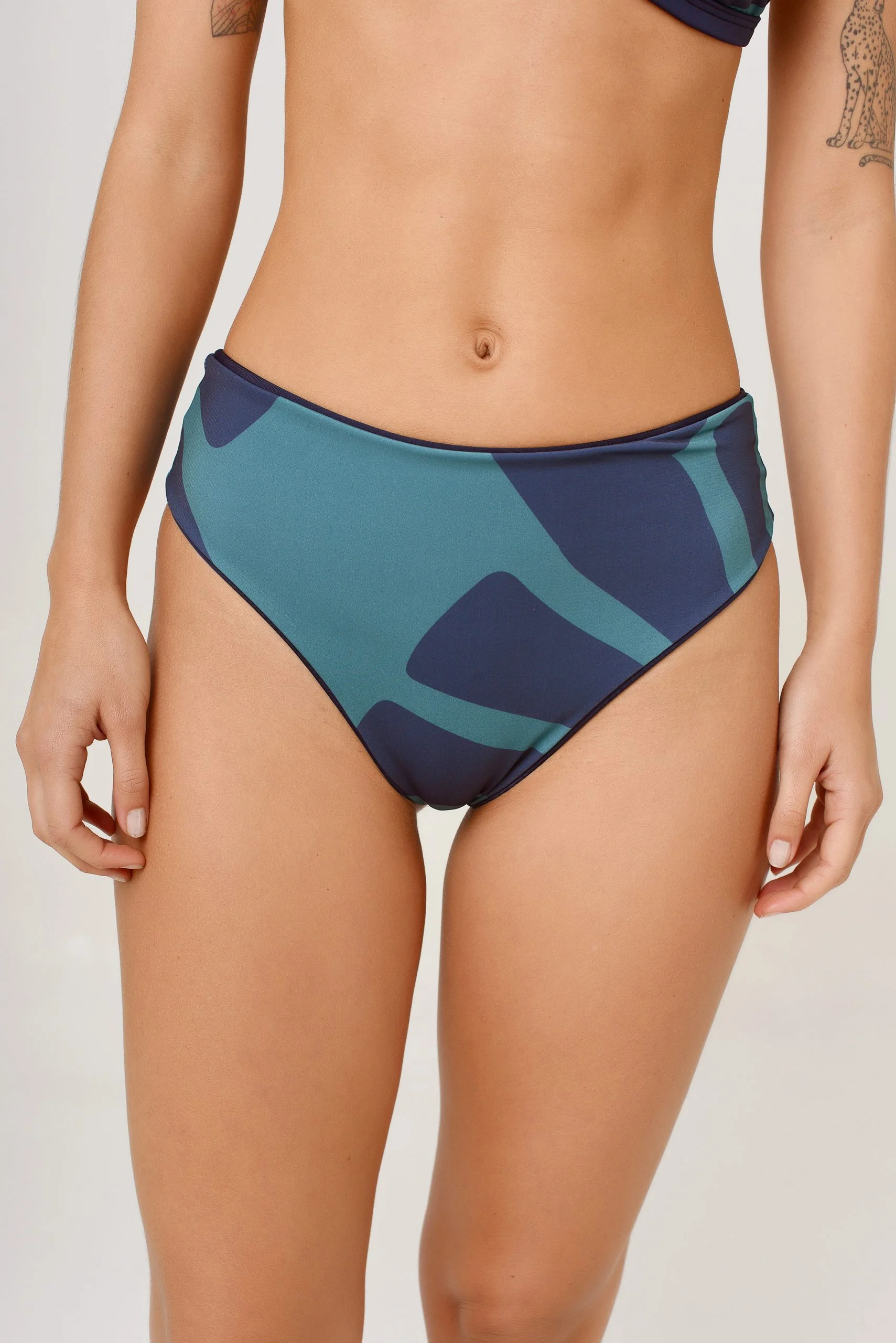 Cola less / Culotte less tiro alto intermedio reversible (dos dedos abajo del ombligo aprox). Calce perfecto! – Estampa de caracolas en azul y verde combinada/reversible con azul marino. Referencia: Ema altura 1.74, medidas 84/65/90 y luce en la foto el talle 1