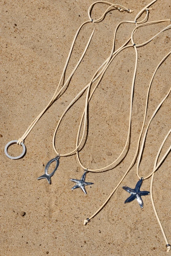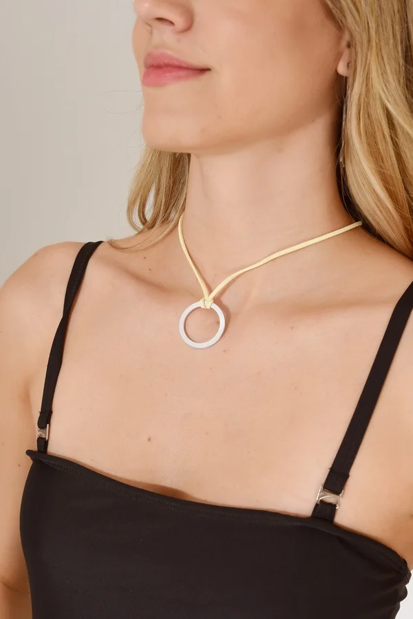 Collar de gamuza color crudo con dije, 130cm de largo.