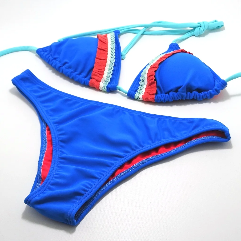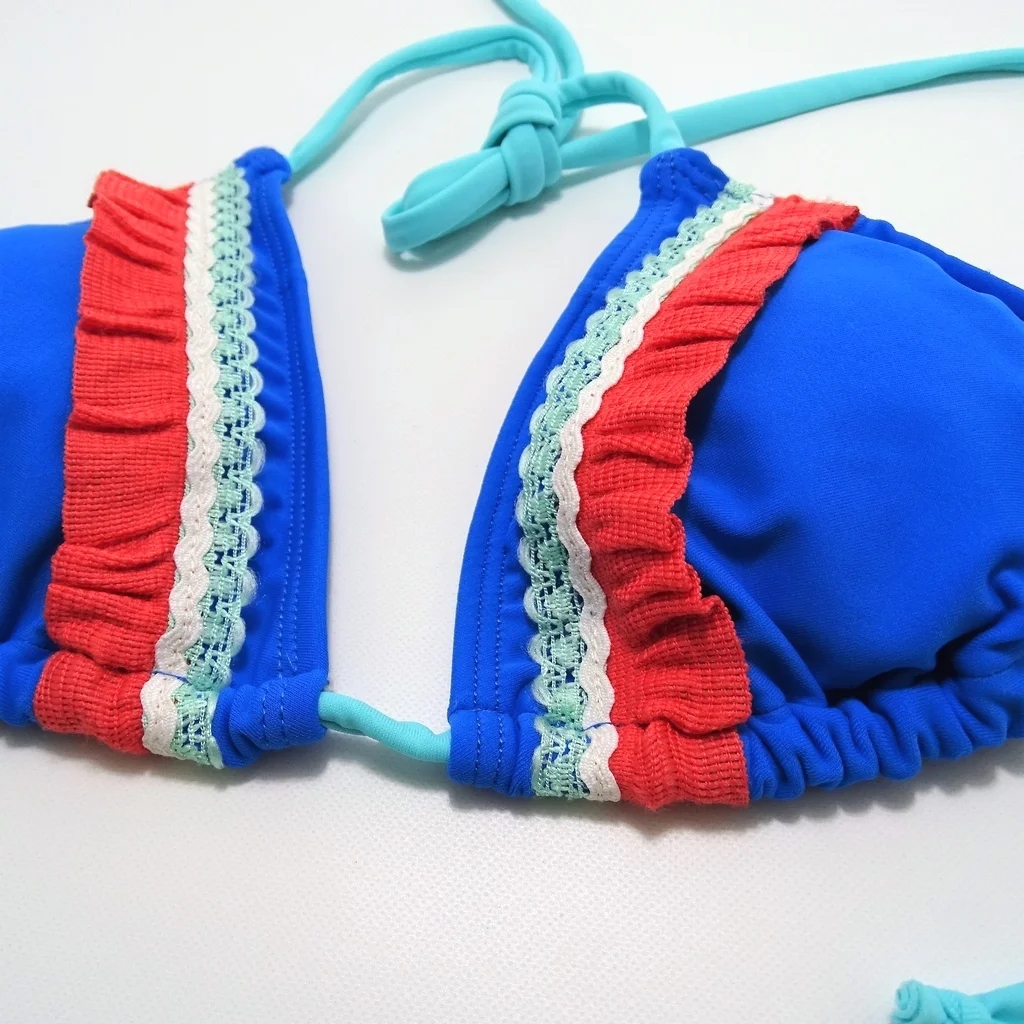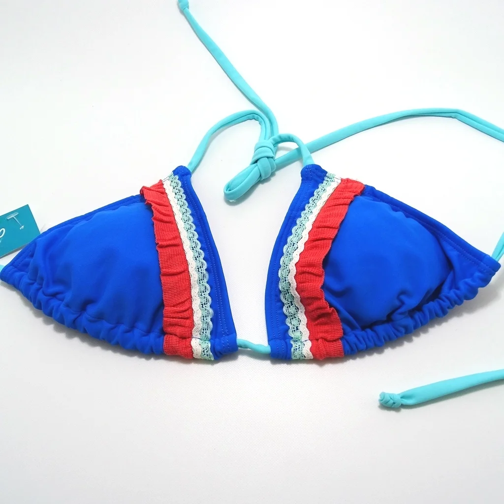 Corpiño triangulito clásico, con breteles combinados y apliques de pasamanería. Forrado en color coral y con bolsillo para tazas/relleno.