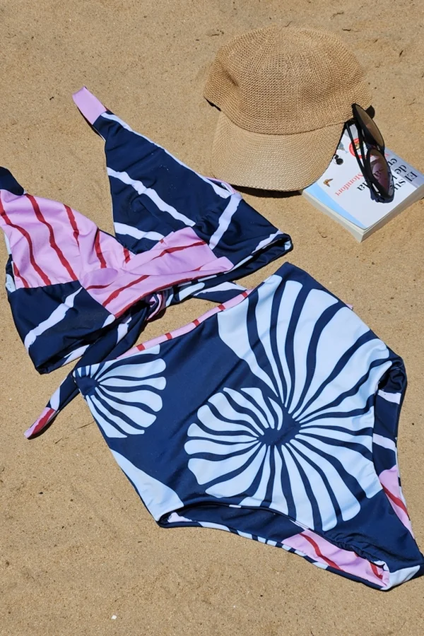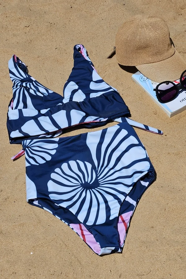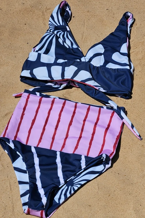 Enteriza / Bikini / simil Tankini consistente de un bombachón alto casi hasta el bajo busto cavado tipo vedetina, y un top escote en V tipo marilyn con base ancha consistente de un lazo que se puede atar atrás o cruzar y atar adelante. Ambas prendas son reversibles permitiendo múltiples formas de uso, y uso en forma separada – Estampa con diseño de caracolas en azul y celeste. Reversible con estampa de rayas en tonos azul, celeste y rojo.