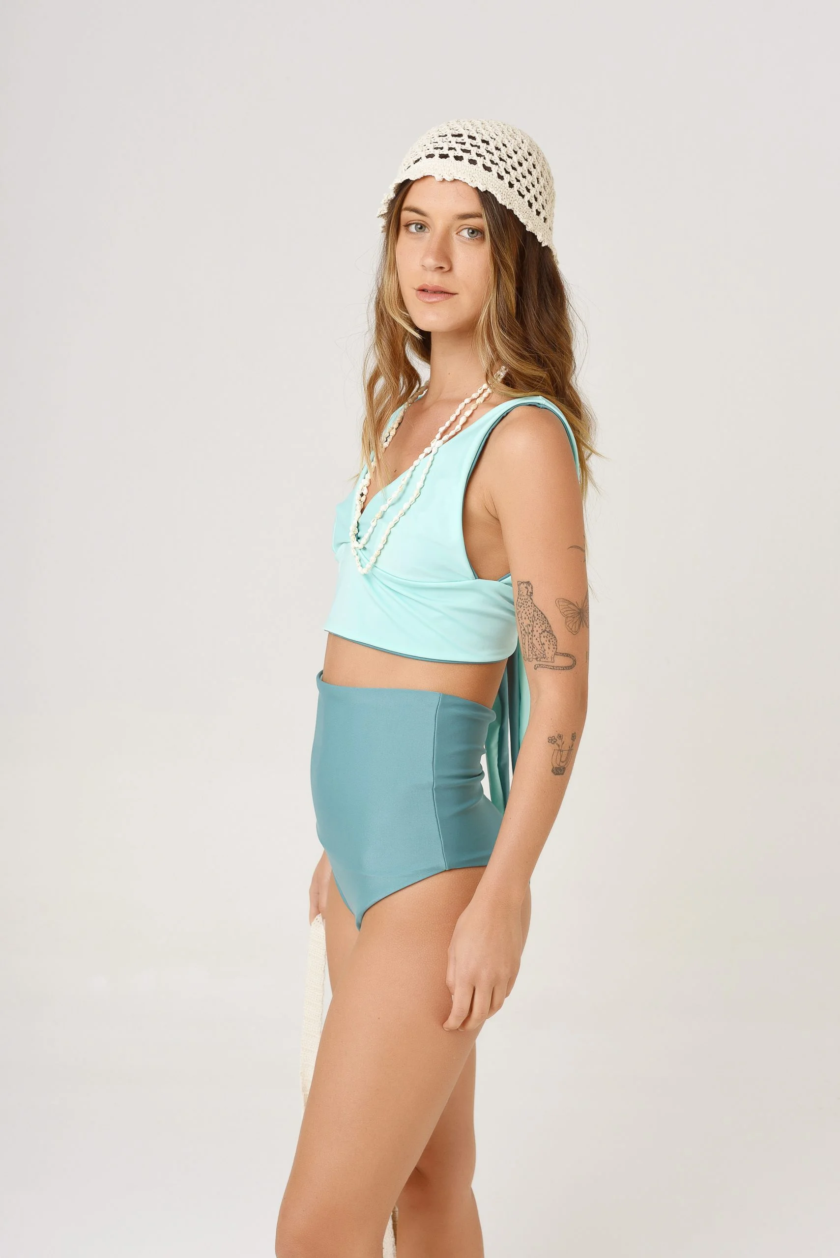 Enteriza / Bikini / simil Tankini consistente de un bombachón alto casi hasta el bajo busto cavado tipo vedetina, y un top escote en V con base ancha consistente de un lazo que se puede atar atrás o cruzar y atar adelante. Ambas prendas son reversibles permitiendo múltiples formas de uso, y uso en forma separada. La parte de arriba queda divina como top para usar con faldas o pantalones. – Combinación de verdes transformative teal y aqua. Referencia: Ema, mide 1.74, 84/65/90 y luce en la foto el talle 2 (que es el más chico)