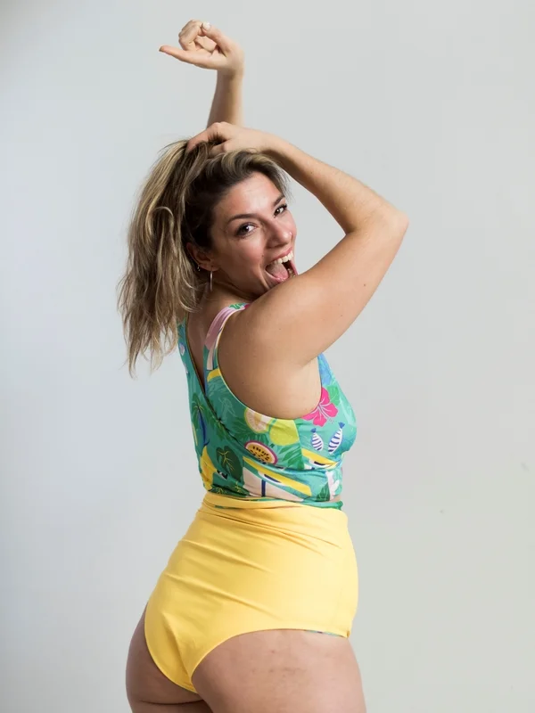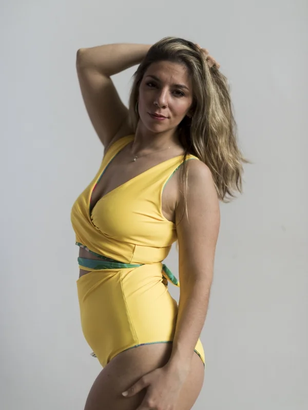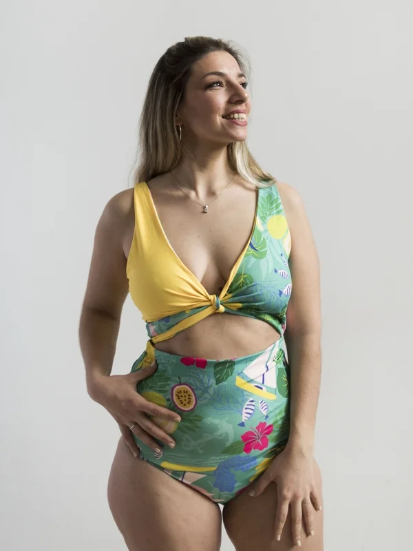 Enteriza / Bikini / simil Tankini consistente de un bombachón alto casi hasta el bajo busto, un top de dos piezas que se cruzan y un lazo que permite atar las partes de diferentes maneras. Todas las piezas son reversibles permitiendo múltiples formas de uso – Inspirada en Ilha Grande y la historia de Coni y Juan de @el_barco_amarillo navegando allí. Base color verde, con flores y frutas tropicales, amarillo, fucsia y más colores. Las prendas reversibles están combinadas con amarillo.