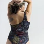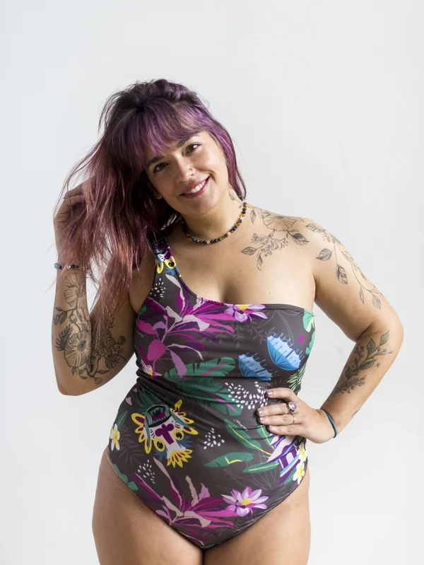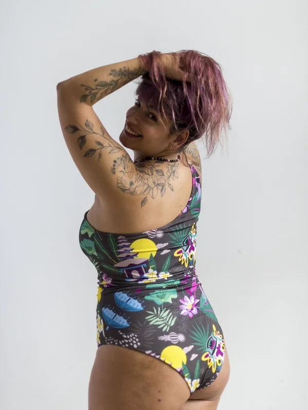 Enteriza reversible con un solo bretel. Espalda alta. Puede combinarse con el top para atar reversible y así tener el segundo bretel y mejor sosten del busto. (El top se vende por separado) – Diseño inspirado en el viaje a Bali de Majo @destinosymaletas . Recrea templos, esculturas, flores y otros elementos típicos de la isla. Base color gris topo con morados, verdes, amarillo. Las prendas que son reversibles están combinadas con color obispo.