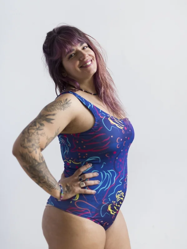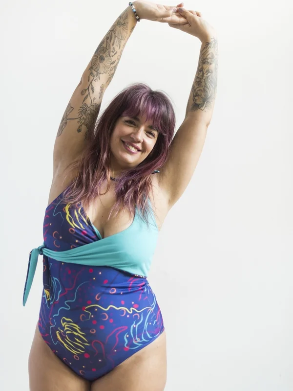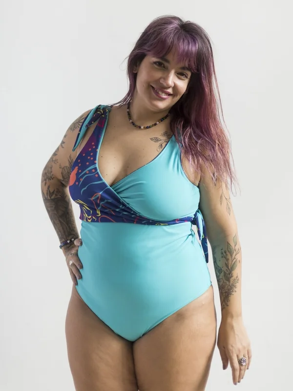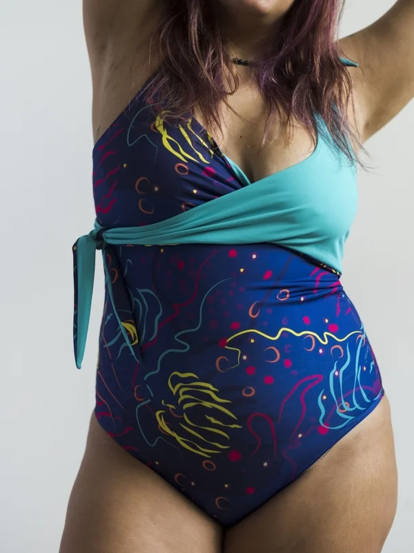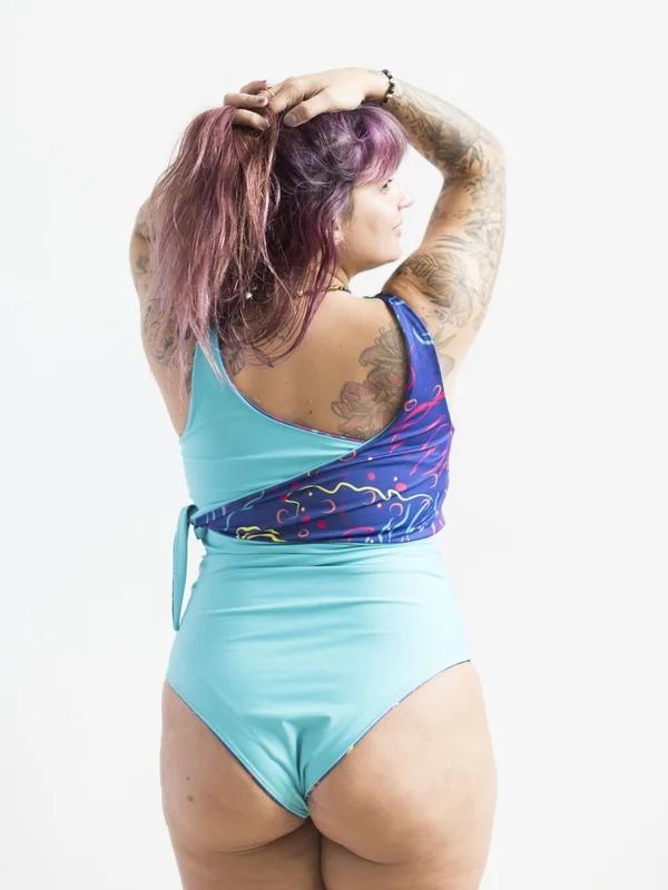 Enteriza reversible con un solo bretel. Espalda alta. Puede combinarse con el top para atar reversible y así tener el segundo bretel y mejor sosten del busto. (El top se vende por separado) – Estampa inspirada en los nudibranquios, que son unos moluscos/babosas de mar generalmente muy pequeños y coloridos. De las criaturas favoritas de los buceadores. Las prendas que son reversibles están combinadas con color turquesa.