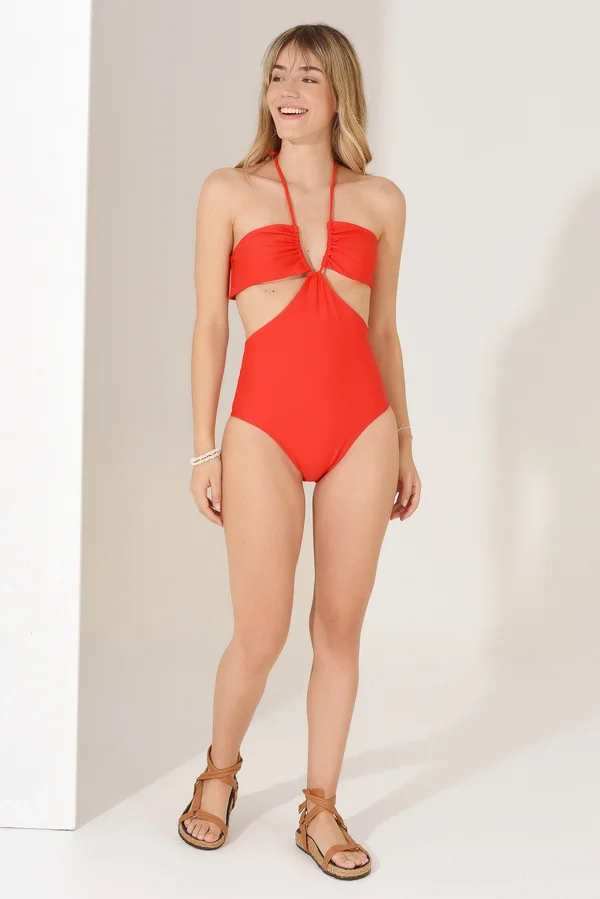 Enteriza con recortes, tipo trikini. Corte super sentador y canchero. Parte de la bombacha bien alta, con cavado tipo vedetina. El corpiño abrocha en la espalda, cuenta con ballenitas a los laterales y espacio para tazas. Los breteles se puede atar de diferentes formas dejando un escote en V (atando al cuello), tipo strapless (atando solo con un moño), o juntando al centro (con un nudo o cruce) y luego al cuello, acomodando el busto de diferentes formas – Color rojo
