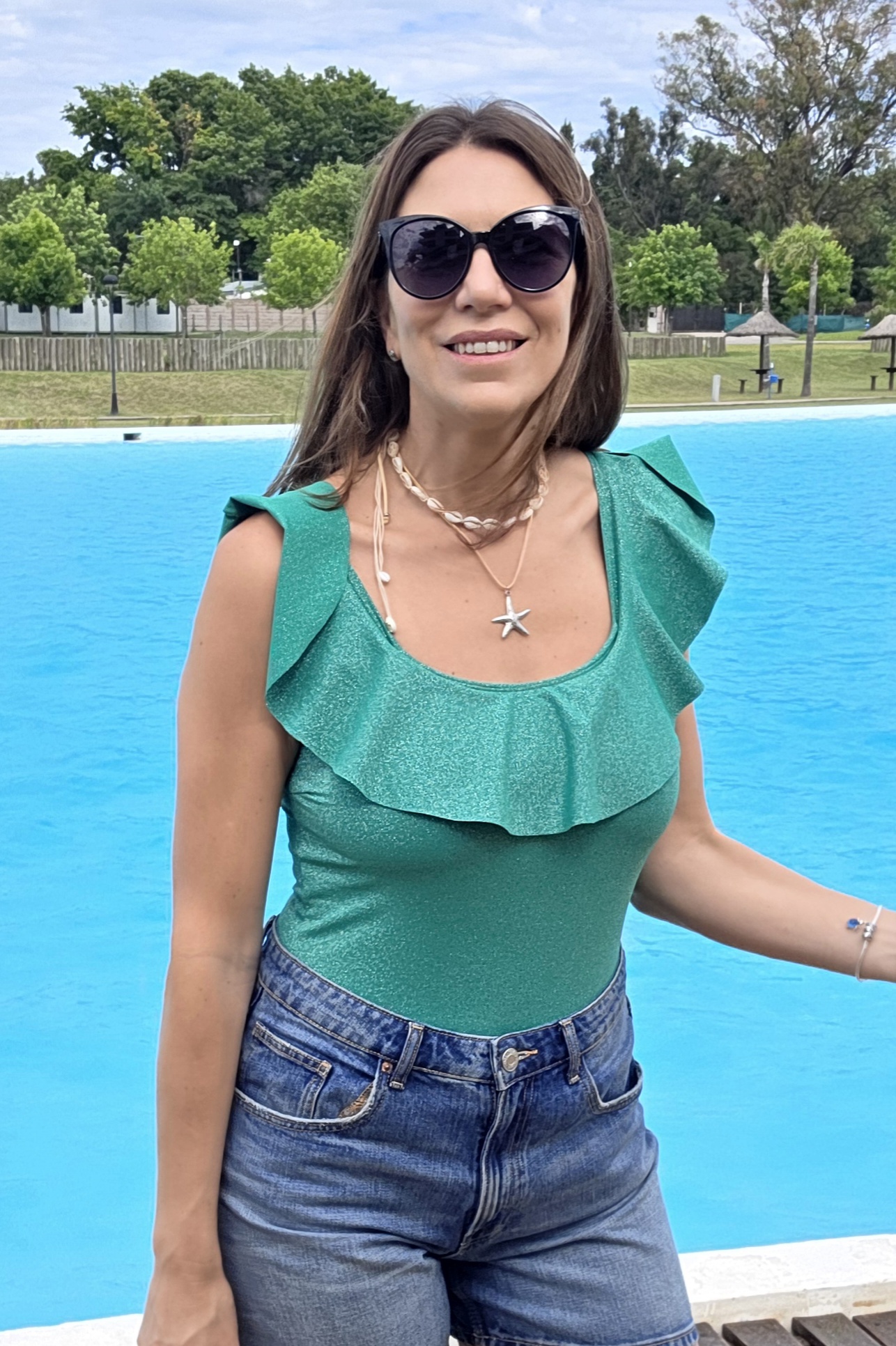 Enteriza tipo strapless con volado. Los breteles se pueden usar de múltiples formas logrando una prenda muy versátil. Como strapless, al hombro o al brazo (tipo paisana) y de forma simétrica o asimétrica (volado en un solo hombro). Espalda alta. Tiene elástico de sostén en el busto y bolsillos para tazas/relleno. También queda divina como body. – Verde texturado, con glitters