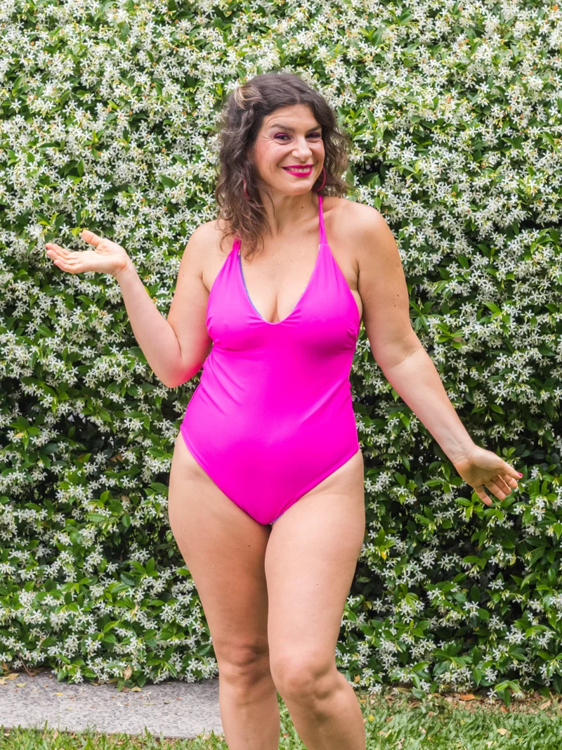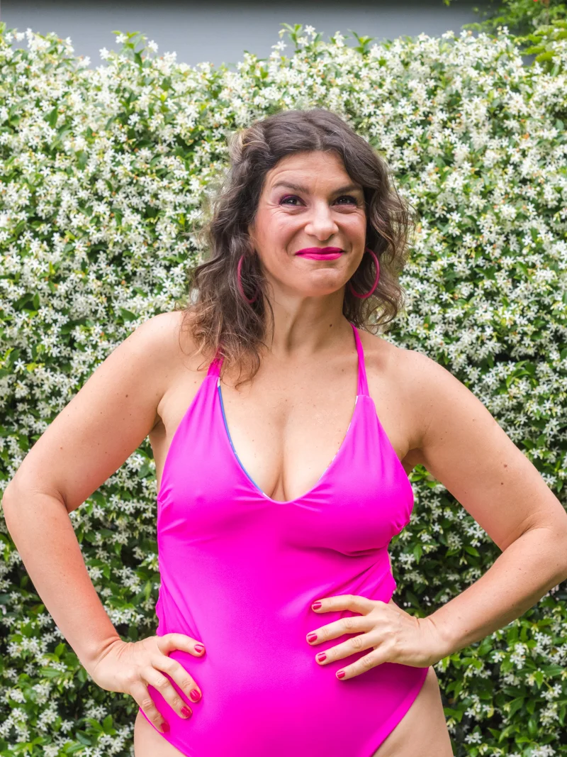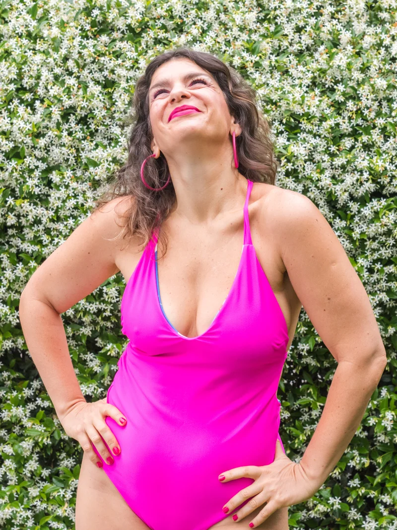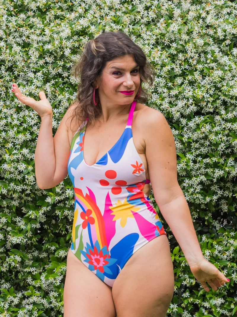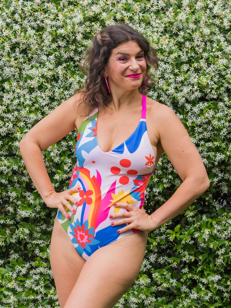 Enteriza reversible, cavado tipo vedetina. Breteles adaptables, para cruzar en la espalda, usar rectos o al cuello. – Estampa multicolor, con flores, mariposas y arco iris. Realizada con la colaboracion de Dalia @daliagutmann, inspirada en su esencia colorida y alegre. (Observacion: las prendas reversibles son con fucsia – Tangsi)