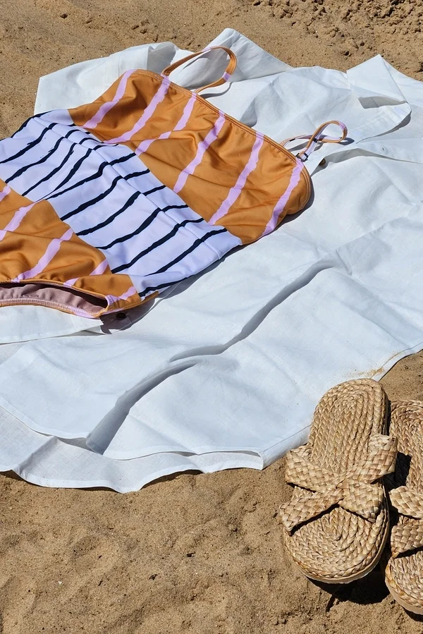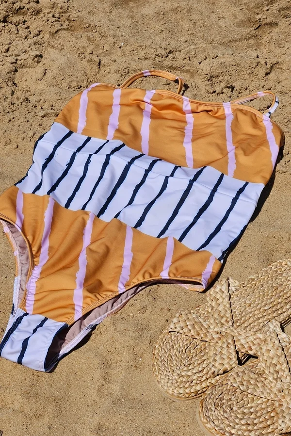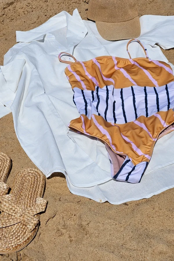 Enteriza Strapless con corte recto y breteles removibles. Corte tipo vedetina. Tiene espacio para tazas y doble forro en el busto. Sentador corte debajo del busto que estiliza la silueta. – Diseño con rayas en color cruzo, azul marino y tostado.