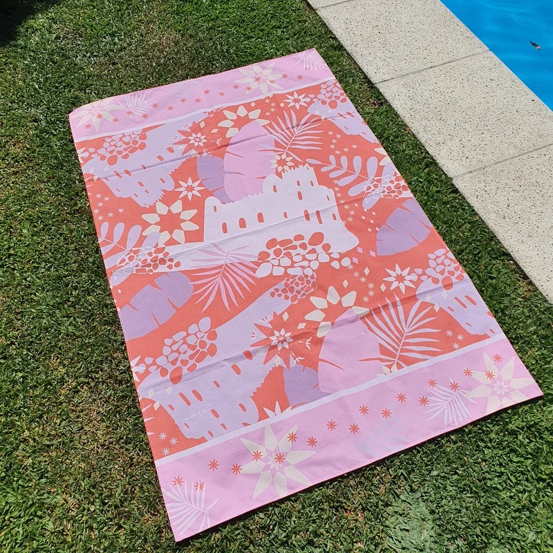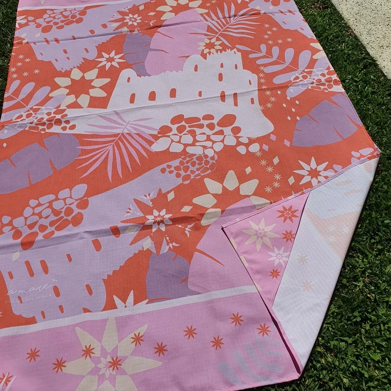 Lona playera. Tela antidesgarro liviana. Medidas 1.5x1m aprox. Tiene orejas en las puntas para colocar arena/ojotas y que no se vuele. Estampa en tonos rosados y lilas con fondo colorado, inspirada en Etiopia, sus castillos y artesanias. Los modelos reversible son con rosa chicle (Turkana)