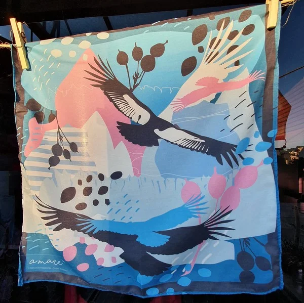 Pañuelo de seda de 45×45 cm aprox Estampa en tonos azulados y rosados. Recrea los paisajes del Parque Nacional Los Glaciares: el glaciar perito moreno, El Chaltén, los témpanos de hielo, cóndores y el fruto del calafate