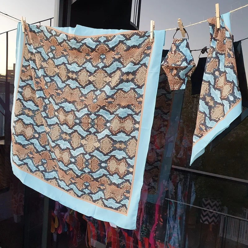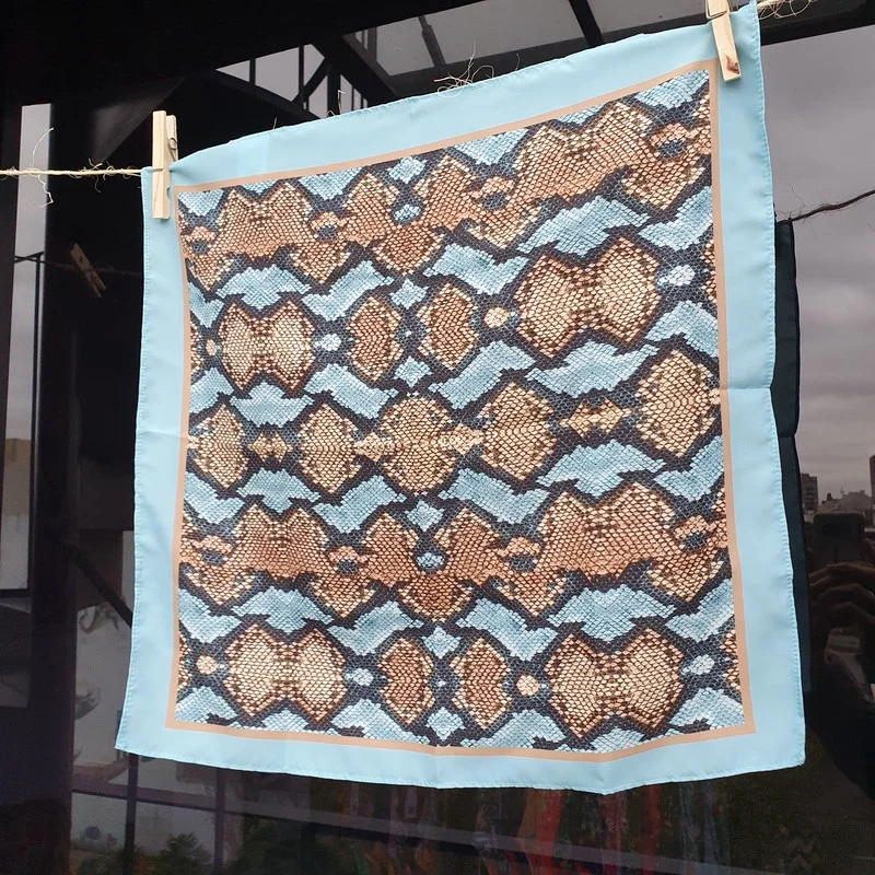Pañuelo de seda de 45×45 cm aprox Estampa de serpiente en tostados y celestes