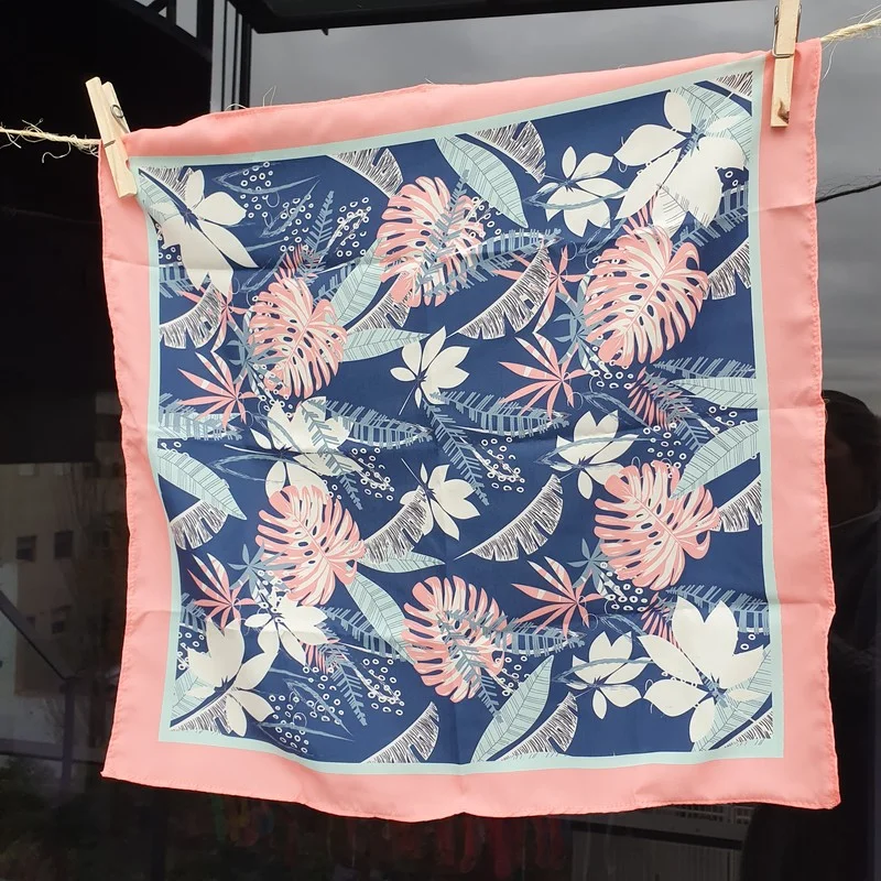 Pañuelo de seda de 45×45 cm aprox Estampa tropical con fondo azul