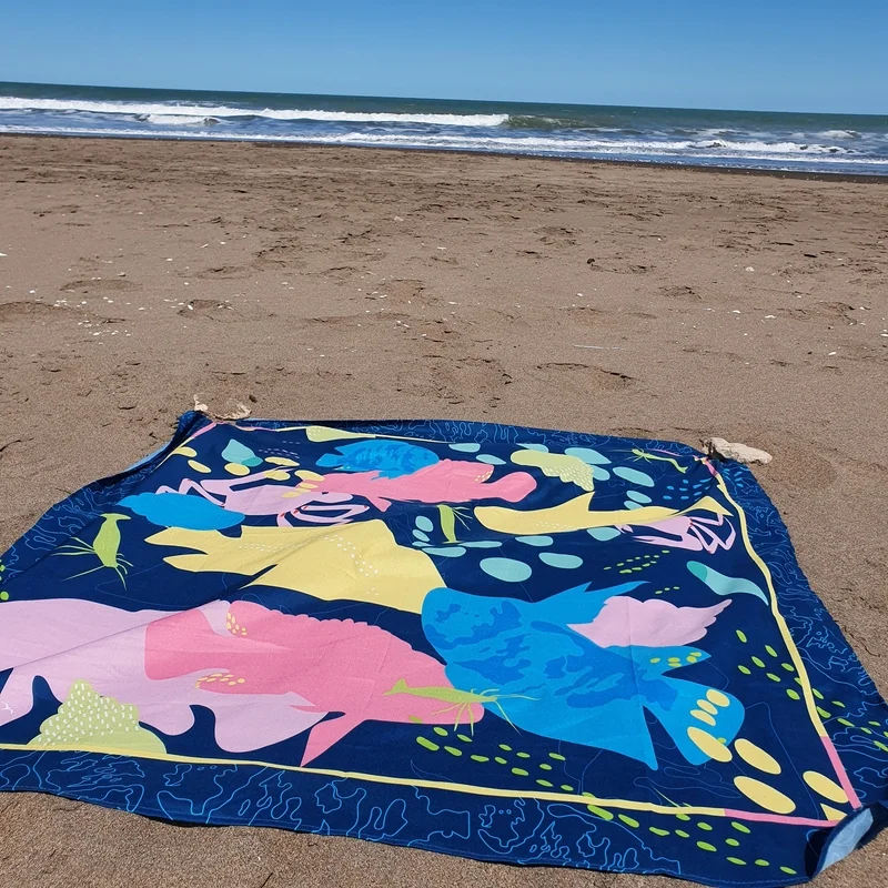 Pañuelo de seda de 90×90 cm aprox Estampa con peces, recreanado la fauna del lago Malawi/Niassa.Color azul, con peces, langostas, cangrejos y caracolas, en azules, rosados, amarillos y verdes. Las prendas reversibles son con el color azul brillante (Mombasa)