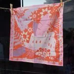 Pañuelo de seda de 90×90 cm aprox Estampa selvatica, con jirafas y elefantes, en tonos verdes, rosados, con amarillo y mas