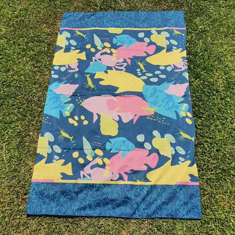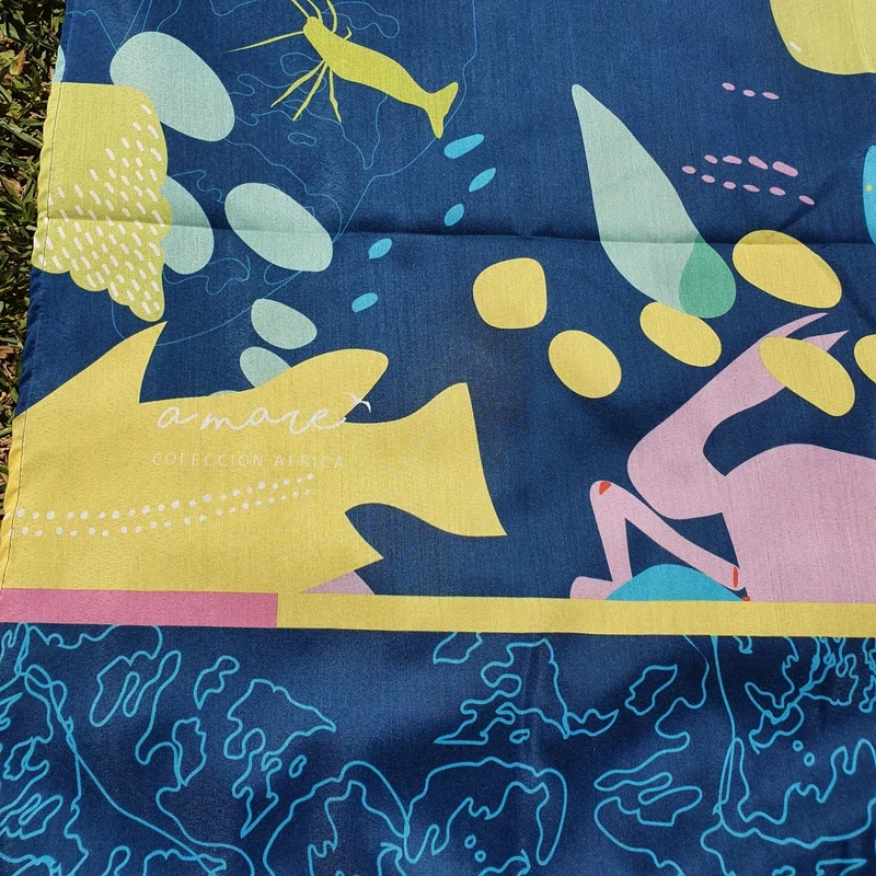 Pañuelo / Pareo de fibrana multiuso. Medidas 1.5x1m aprox Estampa con peces, recreanado la fauna del lago Malawi/Niassa.Color azul, con peces, langostas, cangrejos y caracolas, en azules, rosados, amarillos y verdes. Las prendas reversibles son con el color azul brillante (Mombasa)