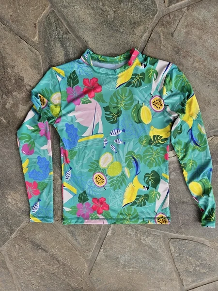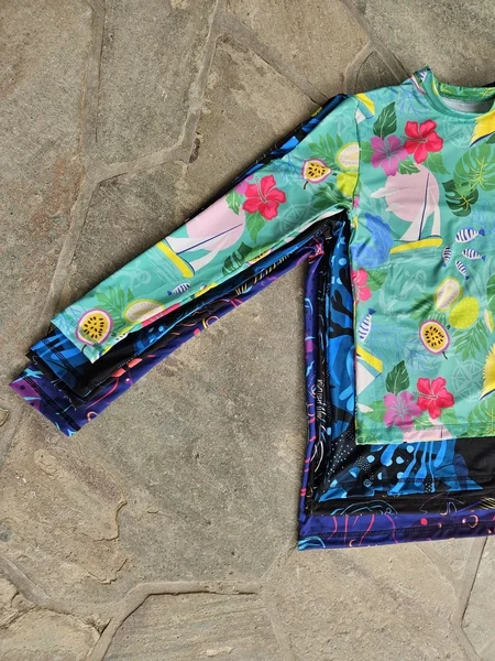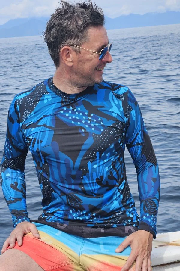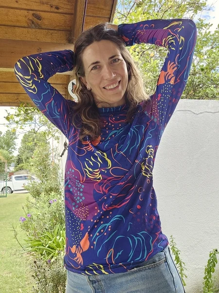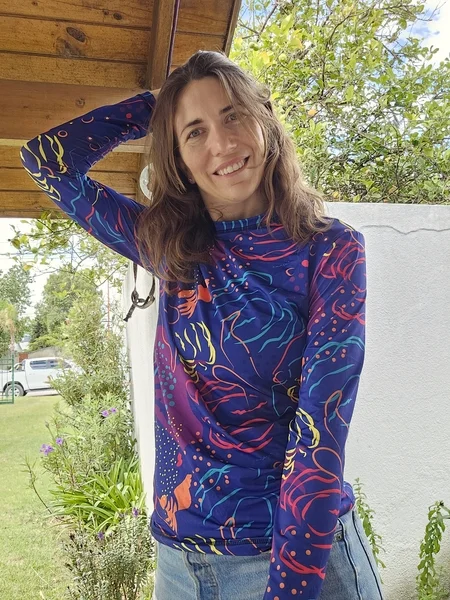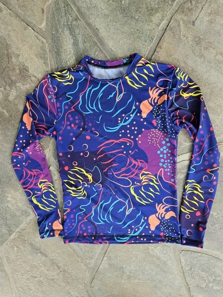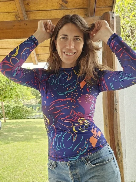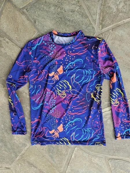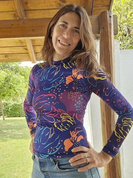 Remera para adultos con protección UV50 de Microfibra con hilo Creora. El talle 2 es más entallado (más femenino), los otros 3 talles son bien unisex. – Estampa inspirada en los nudibranquios, que son unos moluscos/babosas de mar generalmente muy pequeños y coloridos. De las criaturas favoritas de los buceadores. Las prendas que son reversibles están combinadas con color turquesa.
