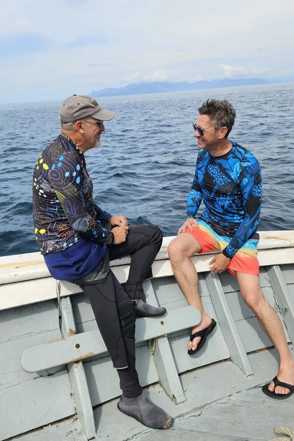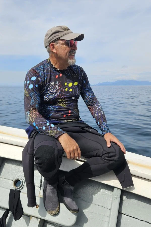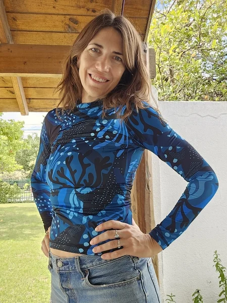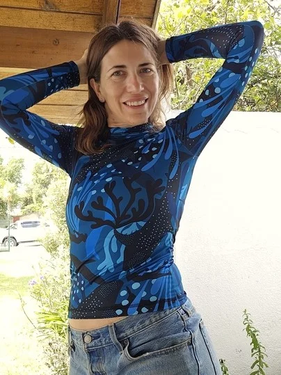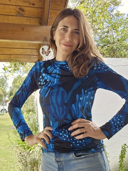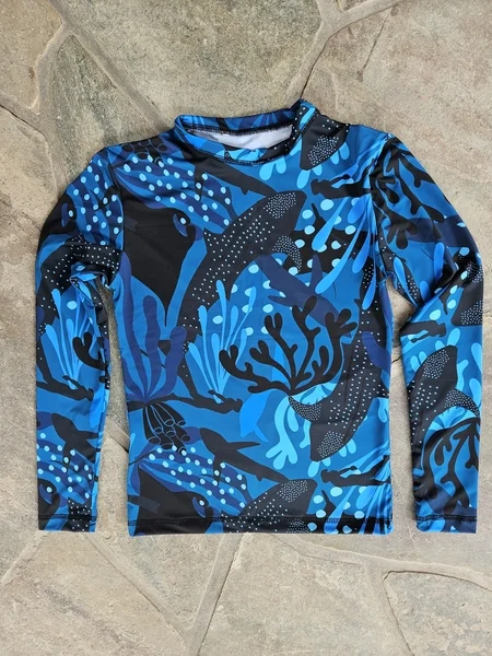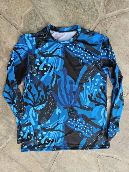Remera para adultos con protección UV50 de Microfibra con hilo Creora. El talle 2 es más entallado (más femenino), los otros 3 talles son bien unisex. — Estampa en tonos azules con tiburones y manta rayas. Inspirada en @gadormunta, su vida como oceanografa y cientifica marina especialista en tiburones y sus inmersiones en el oceano pacifico especialmente en la zona de Baja California.