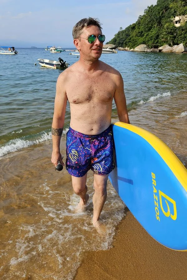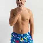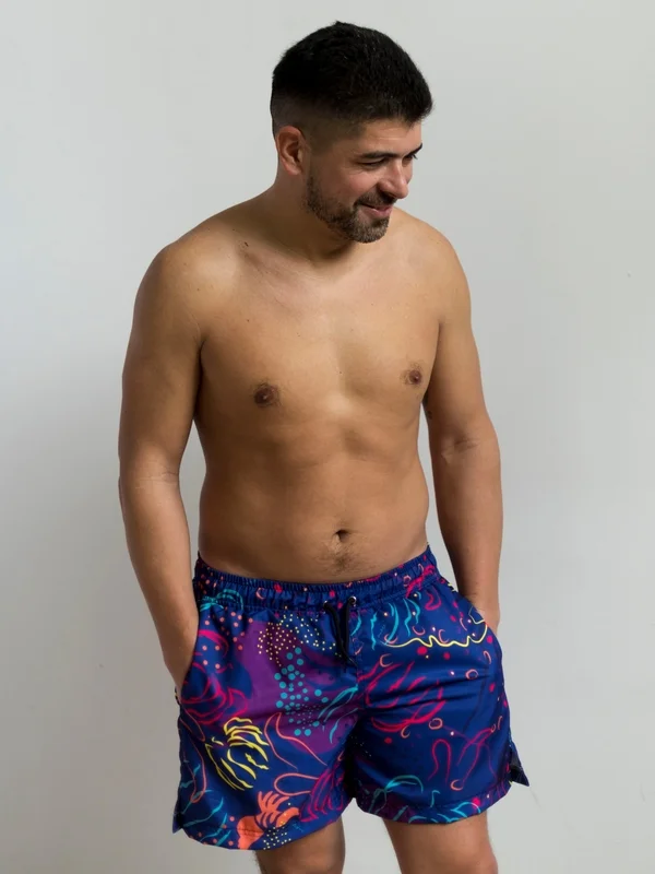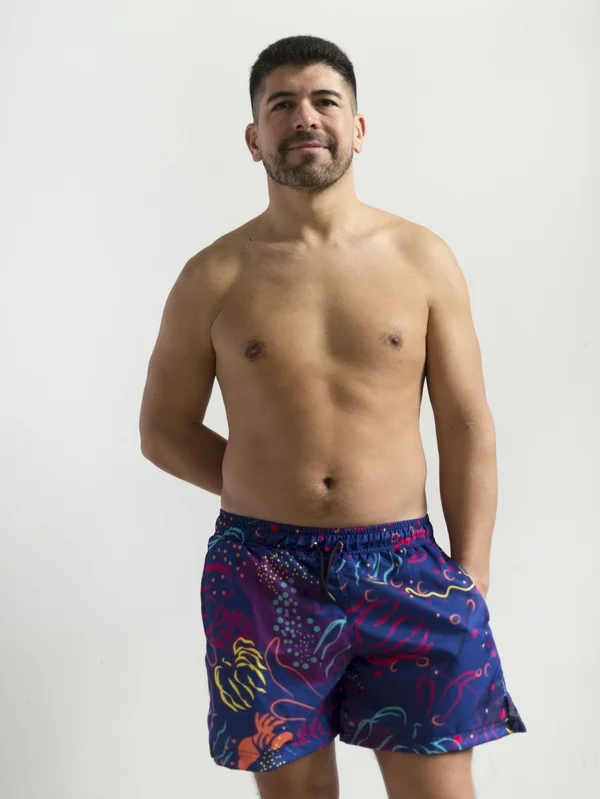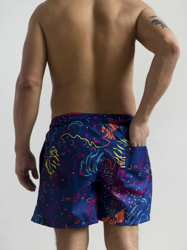 Short de microfibra, con sujetador, para adulto. – Estampa inspirada en los nudibranquios, que son unos moluscos/babosas de mar generalmente muy pequeños y coloridos. De las criaturas favoritas de los buceadores. Las prendas que son reversibles están combinadas con color turquesa.