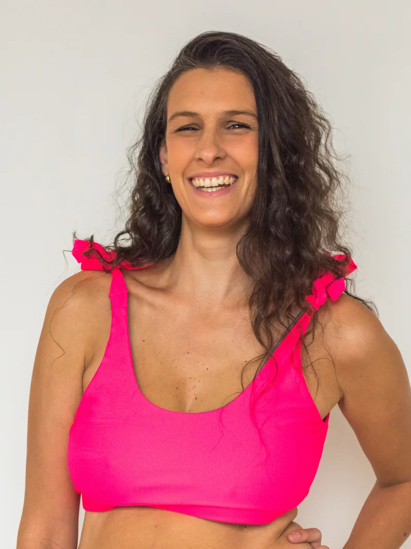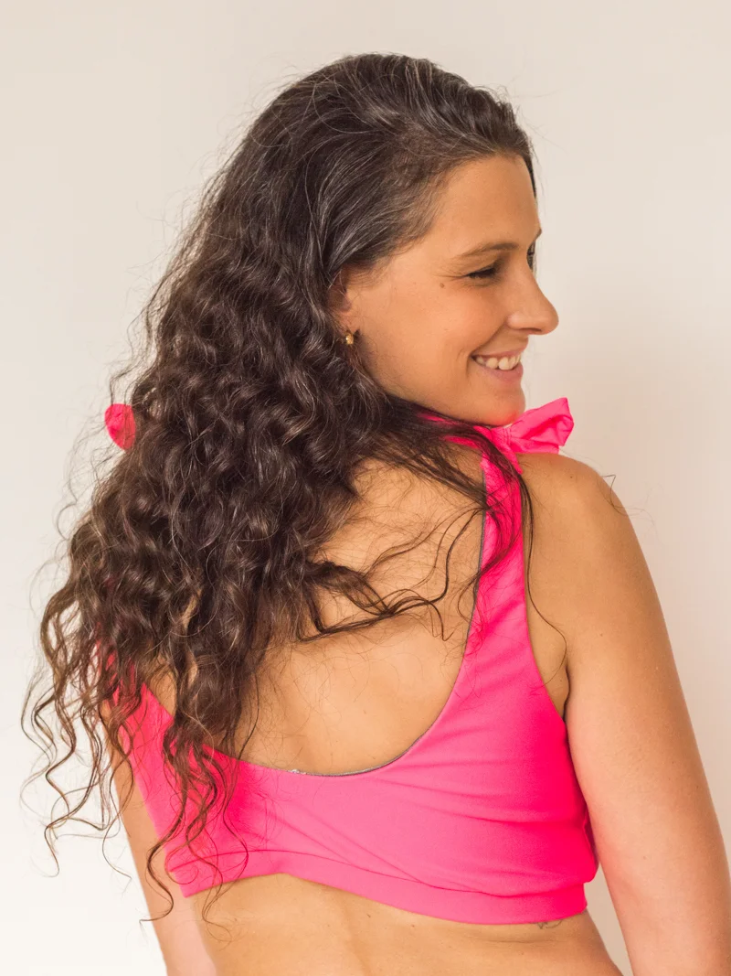 Top tipo deportivo con breteles para atar. Es reversible y tiene un elástico ancho bajo busto – Color gris brillante. (Observacion: las prendas reversibles son con coral fluo – Balos)