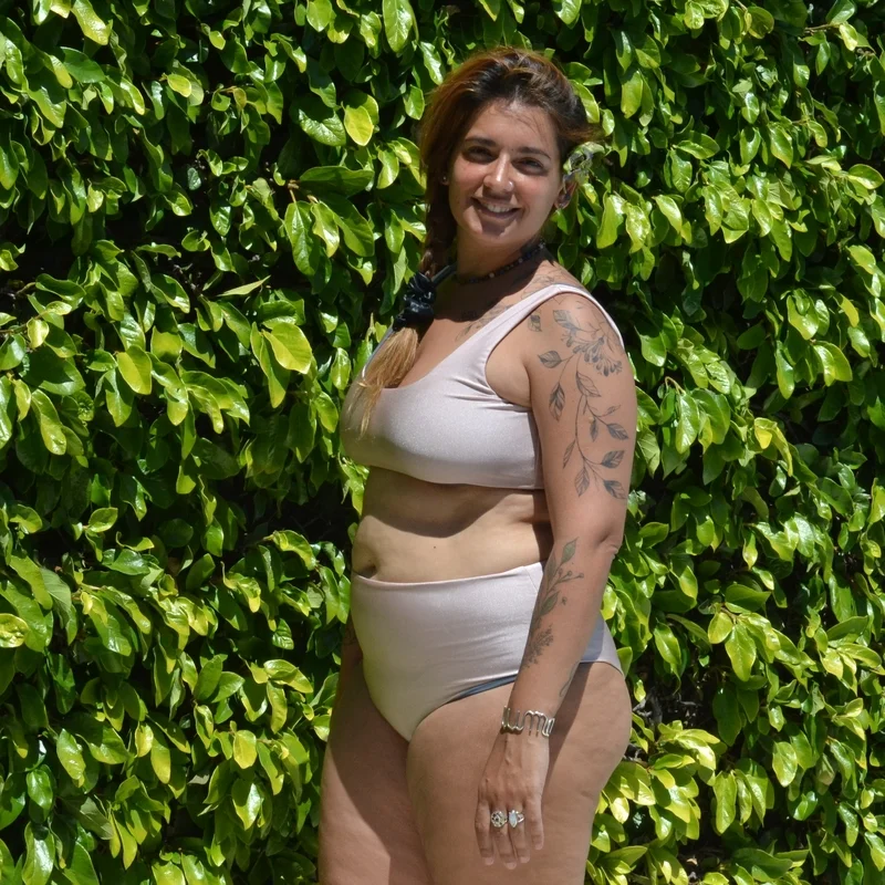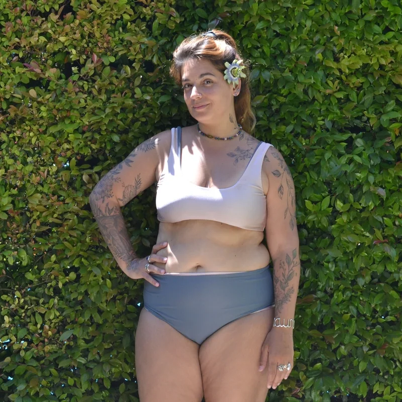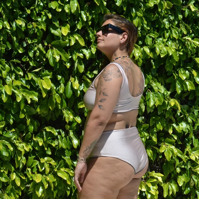 Top tipo deportivo con breteles fijos. Es reversible Color gris. Las prendas reversibles son con color arena/nude (opaco para las enterizas y brillante para las bikinis)