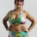 Top para atar reversible. Ata en el cuello y en la espalda adaptandose a diferentes cuerpos. Se puede usar en combinacion con la enteriza asimetrica reversible, colocandose de costado y completando el hombro descubierto – Estampa inspirada en los nudibranquios, que son unos moluscos/babosas de mar generalmente muy pequeños y coloridos. De las criaturas favoritas de los buceadores. Las prendas que son reversibles están combinadas con color turquesa.