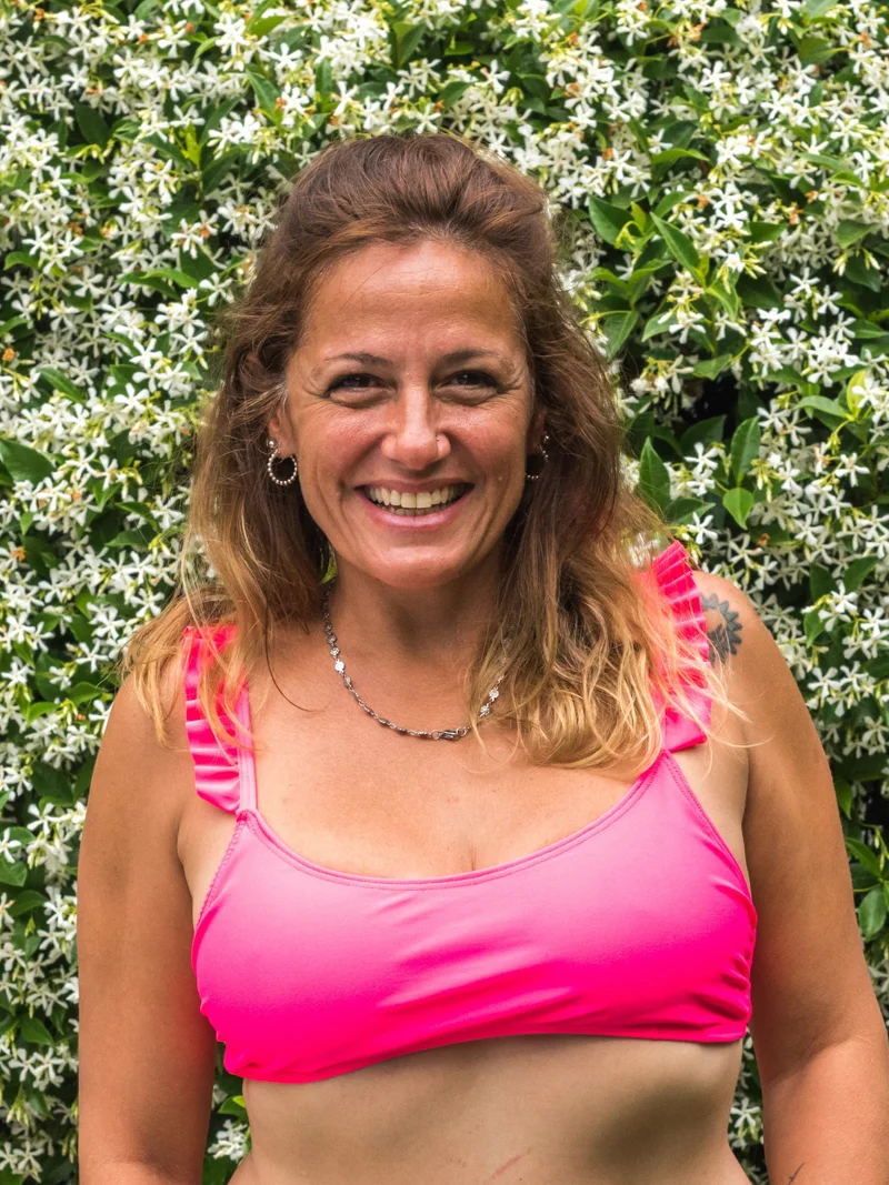 Top con volados en los breteles. Breteles regulables. Ata atras adaptandose a diferentes anchos de espalda. Tiene bolsillo para taza. (Observacion: es más escotado que el de la coleccion Africa) – Color coral fluo
