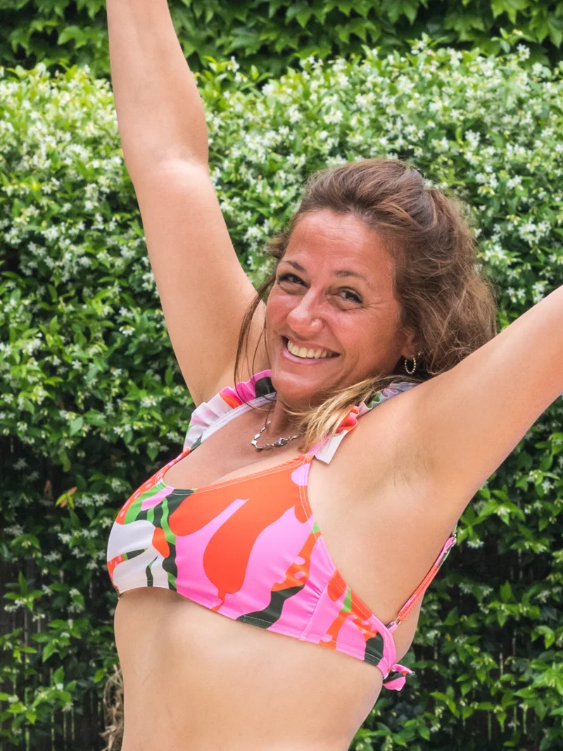 Top con volados en los breteles. Breteles regulables. Ata atras adaptandose a diferentes anchos de espalda. Tiene bolsillo para taza. (Observacion: es más escotado que el de la coleccion Africa) – Estampa multicolor, con flores y colores rosados, colorados y verdes. Motivos flower power inspirados en los años 70 y movimiento hippie. Realizada con la colaboracion de Keku @sentirdistinto reflejando su esencia (Observacion: las prendas reversibles son con verde – Papakolea)