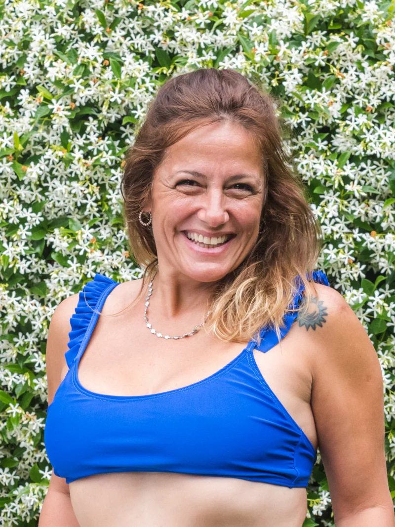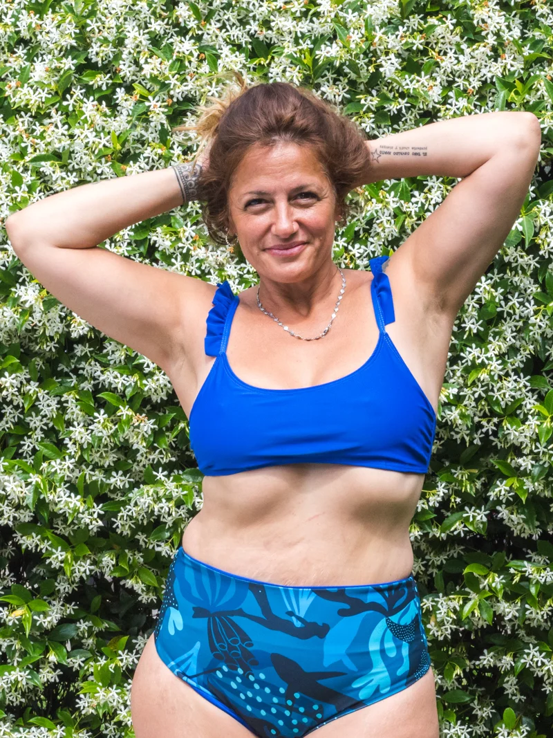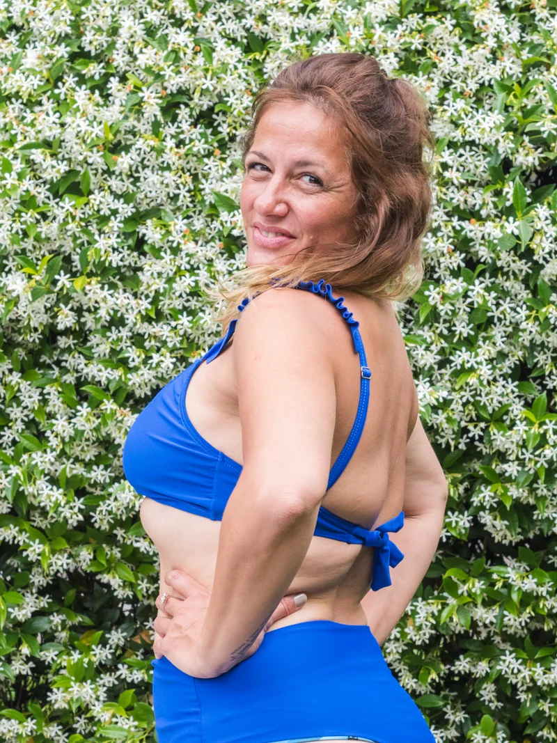 Top con volados en los breteles. Breteles regulables. Ata atras adaptandose a diferentes anchos de espalda. Tiene bolsillo para taza. (Observacion: es más escotado que el de la coleccion Africa) – Color azul francia