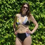 Triangulito clasico con recorte. Tiras largas para poder cruzar por delante (se pueden cortar tambi鮩. Se pueden colocar tazas Estampa inspirada en la selva africana, con animales (jirafas y elefantes) y mucho verde. Las prendas reversibles son con color verde (Uganda)