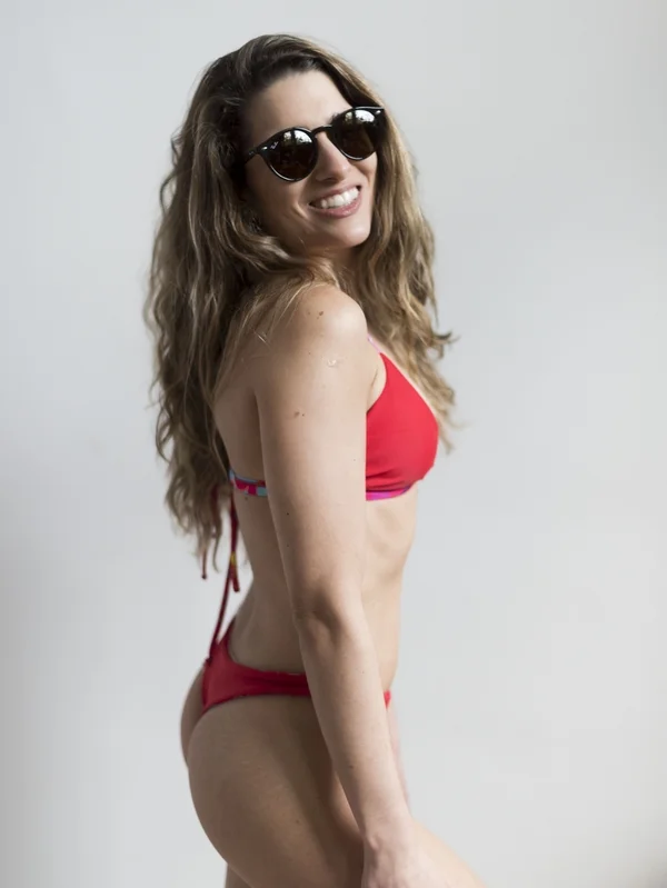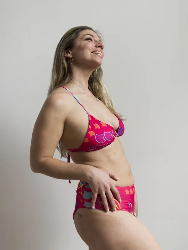 Triangulito fijo reversible y regulable. Calce perfecto. Los breteles se pueden usar cruzados en la espalda o rectos. – Base color coral con tonos morados, turquesa y amarillo. Colores vibrantes. Inspirada en la vida marina de los arrecifes de coral, particularmente en peces angel, peces mariposas y bailarina española. Las prendas que son reversibles están combinadas con rojo.
