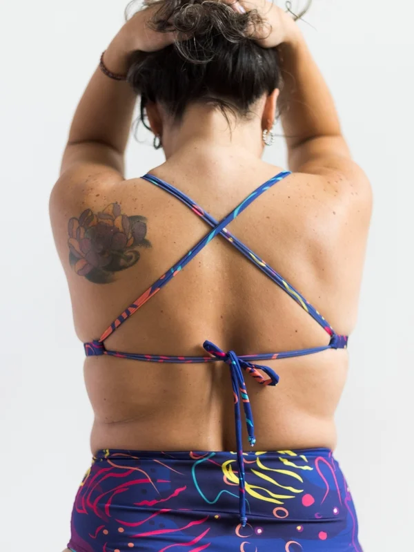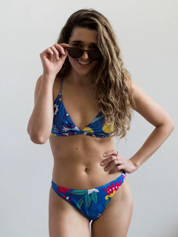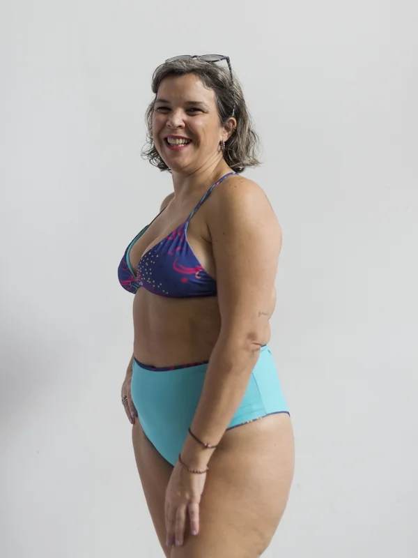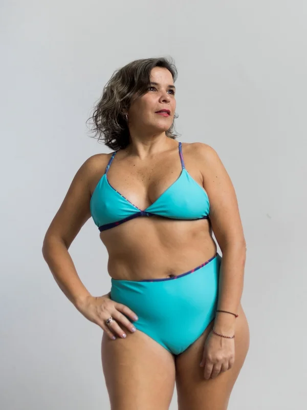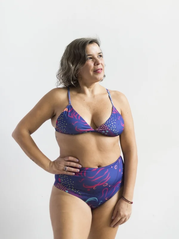 Triangulito fijo reversible y regulable. Calce perfecto. Los breteles se pueden usar cruzados en la espalda o rectos. – Estampa inspirada en los nudibranquios, que son unos moluscos/babosas de mar generalmente muy pequeños y coloridos. De las criaturas favoritas de los buceadores. Las prendas que son reversibles están combinadas con color turquesa.