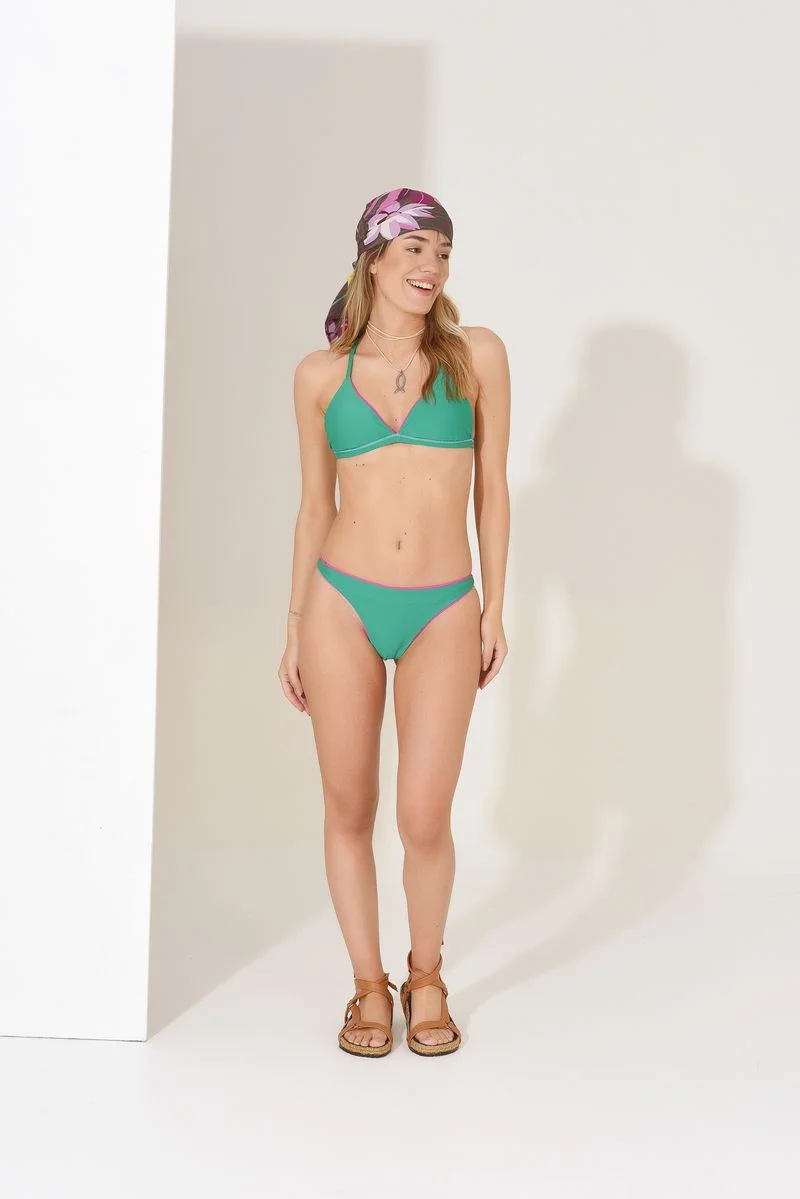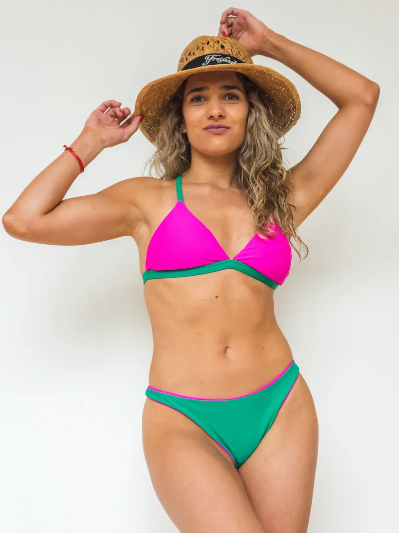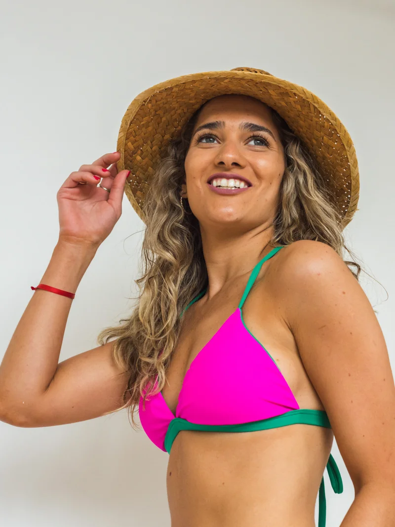 Triangulito fijo reversible y regulable. Taza incluida. Calce perfecto. Los breteles se pueden usar cruzados en la espalda o rectos. – Color fucsia. (Observacion: las prendas reversibles son con verde – Papakolea)