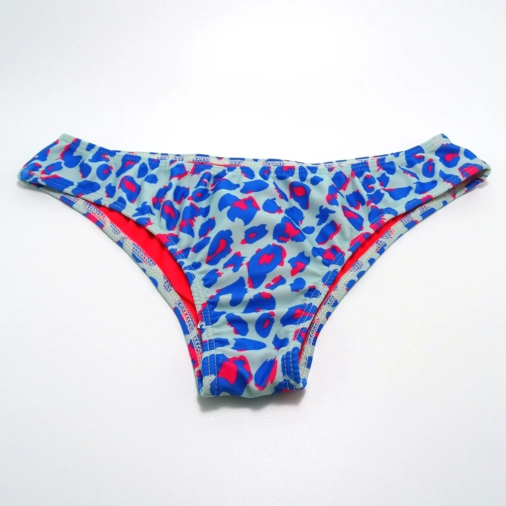 Vedetina ancha tiro medio. Forrada en color coral. (Observación: es el modelo de bombacha más amplio, en cuanto al ancho de caderas y cavado de cola) Animal print en azul y fucsia sobre base aqua. Detalle de tiras en color azul (según modelo). Combinaciones sugeridas: Niza
