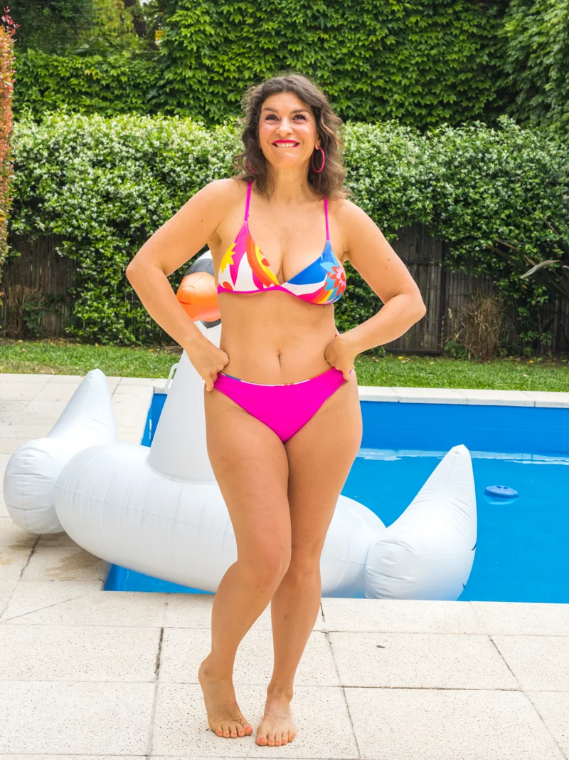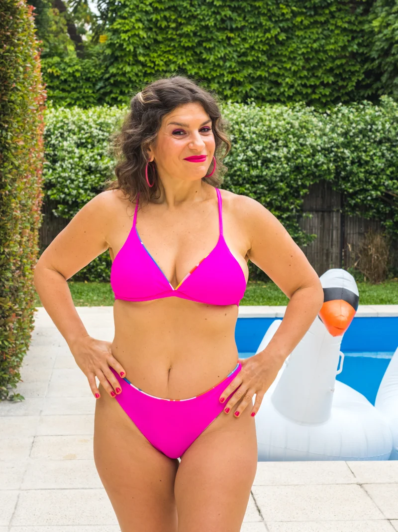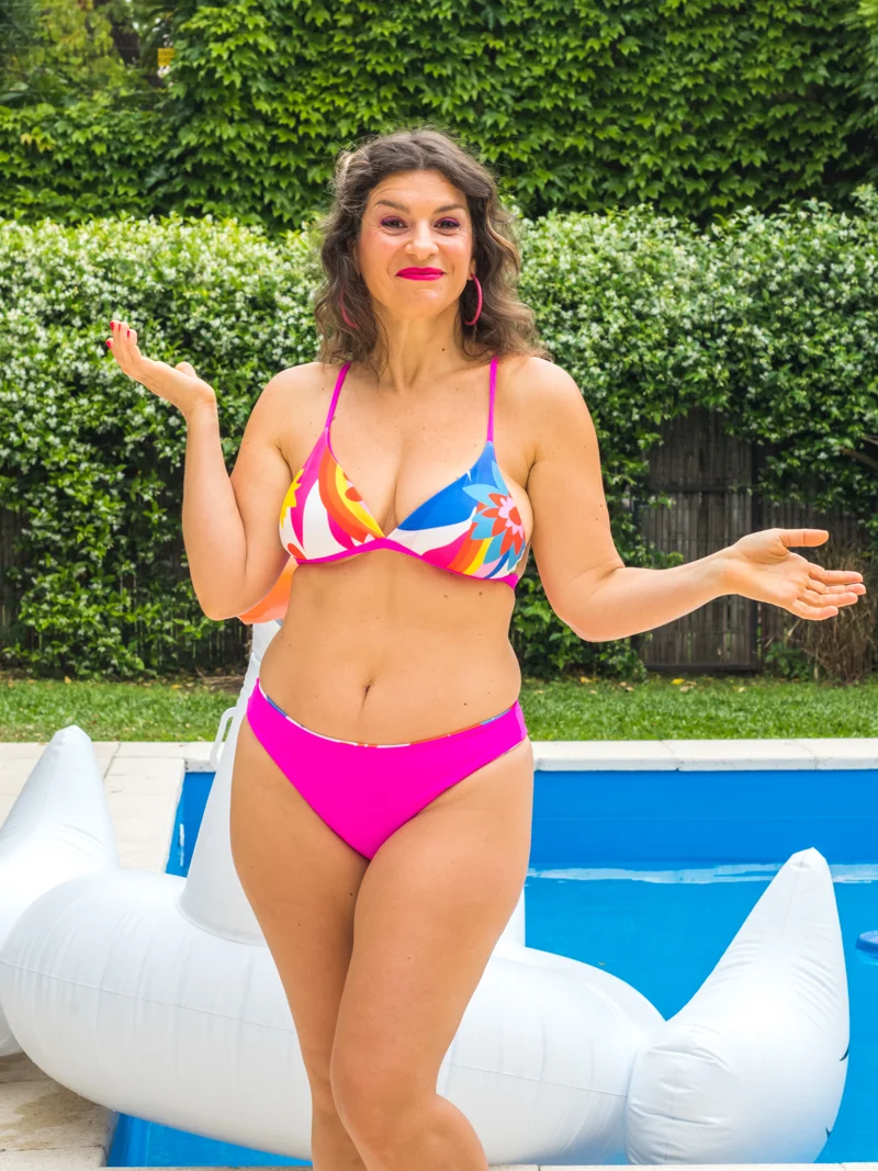 Vedetina reversible. Corte clasico, tiro medio. (Observacion: las prendas reversibles son un poco mas amplias y ajustan menos que las que no lo son) – Estampa multicolor, con flores, mariposas y arco iris. Realizada con la colaboracion de Dalia @daliagutmann, inspirada en su esencia colorida y alegre. (Observacion: las prendas reversibles son con fucsia – Tangsi)