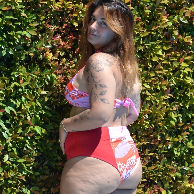 Bombacha tiro alto (al ombligo) con recortes. Corte tipo Culotte. Costura embolsada en cintura que no aprieta/marca Estampa en tonos rosados y lilas con fondo colorado, inspirada en Etiopia, sus castillos y artesanias. Los modelos reversible son con rosa chicle (Turkana)