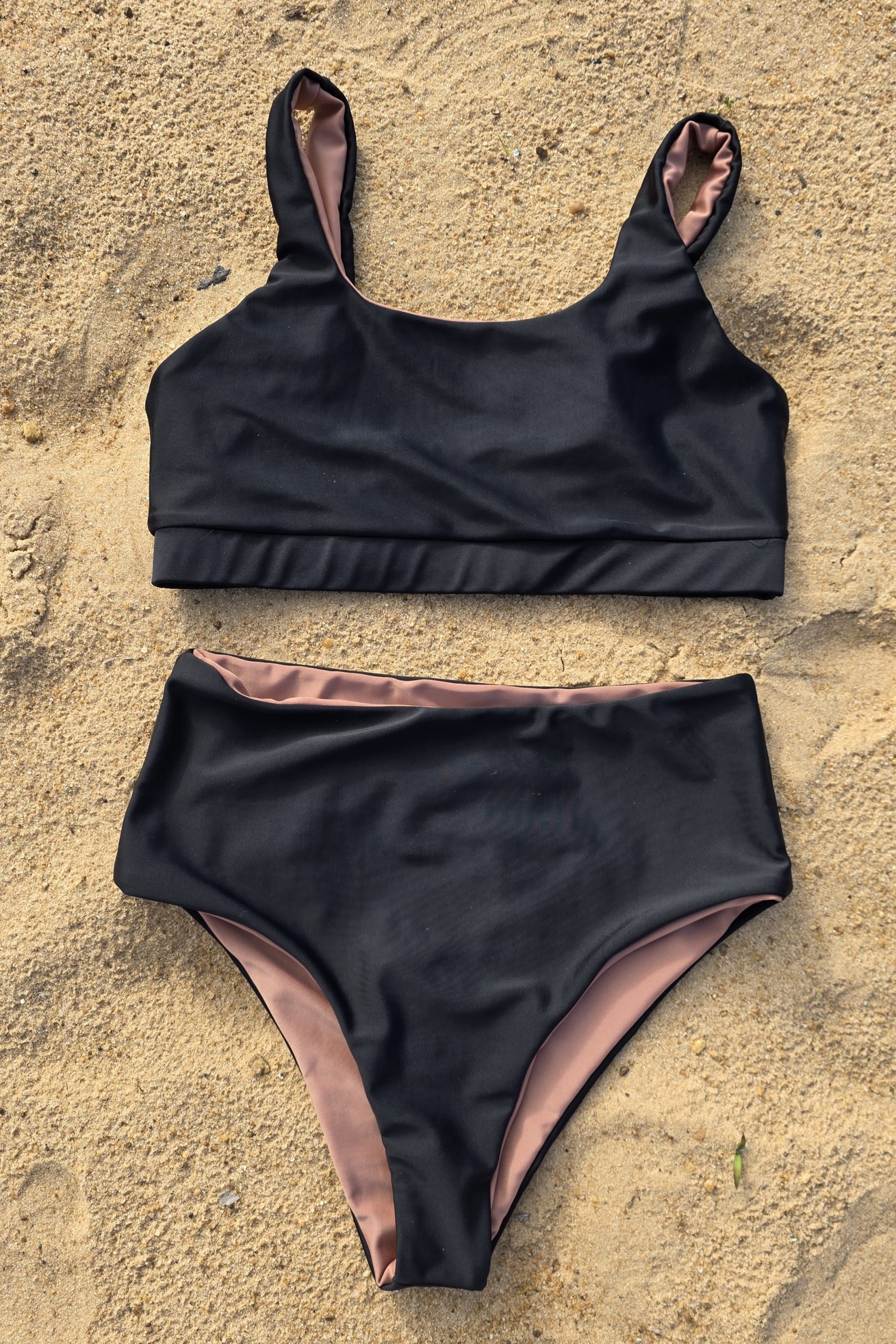 Bombacha tiro alto (al ombligo) reversible. Corte tipo Culotte. Super cómoda, sostiene muy bien al ser alta y con doble lycra. Se puede doblar la cintura y queda con tiro medio. Se puede usar más o menos cavada y alta. Una de las prendas favoritas – Color negro combinado o reversible con mocha mousse