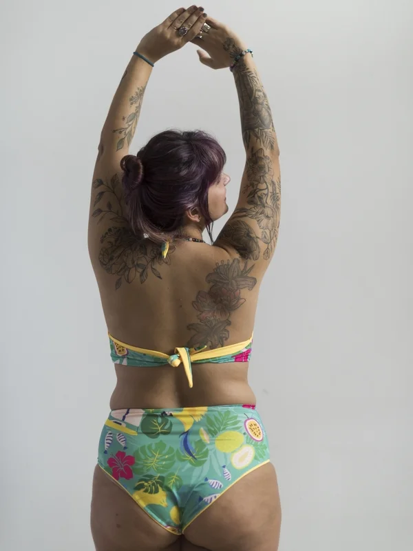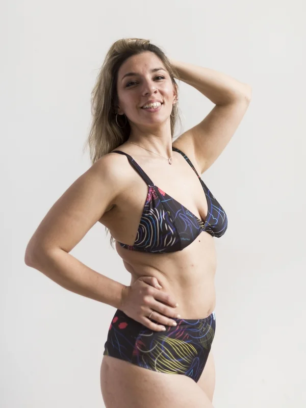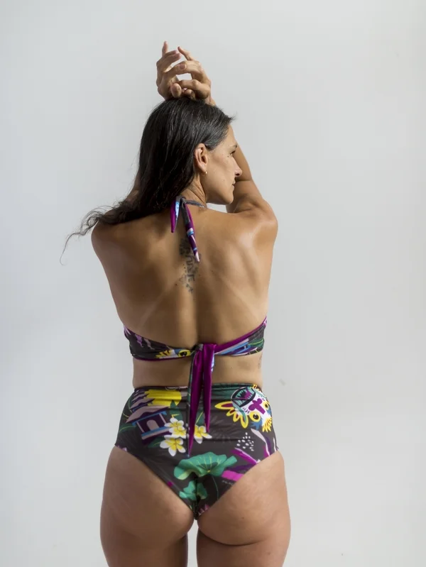 Bombacha tiro alto (al ombligo) reversible. Corte tipo Culotte. Se puede doblar la cintura y queda con tiro medio. (Observacion: las prendas reversibles son un poco mas amplias, ajustan menos y se suelen cavar un poco mas en la cola que las que no lo son) – Estampa con base negra/gris oscuro inspirada en el mundo submarino, los peces angel, especialmente en el pez angel emperador. Las prendas reversibles son combinadas con negro.