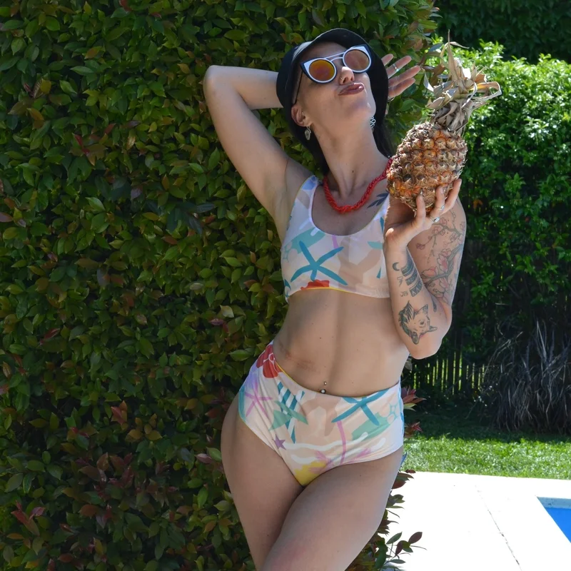 Bombacha tiro alto (al ombligo) reversible. Corte tipo Culotte. Se puede doblar la cintura y queda con tiro medio. (Observacion: las prendas reversibles son un poco mas amplias, ajustan menos y se suelen cavar un poco mas en la cola que las que no lo son) Estampa inspirada en la isla de Lamu, color arena, con estrellas, dhows, caracolas, burros, palmeras y mas. Los modelos reversible son con amarillo (Pipa)