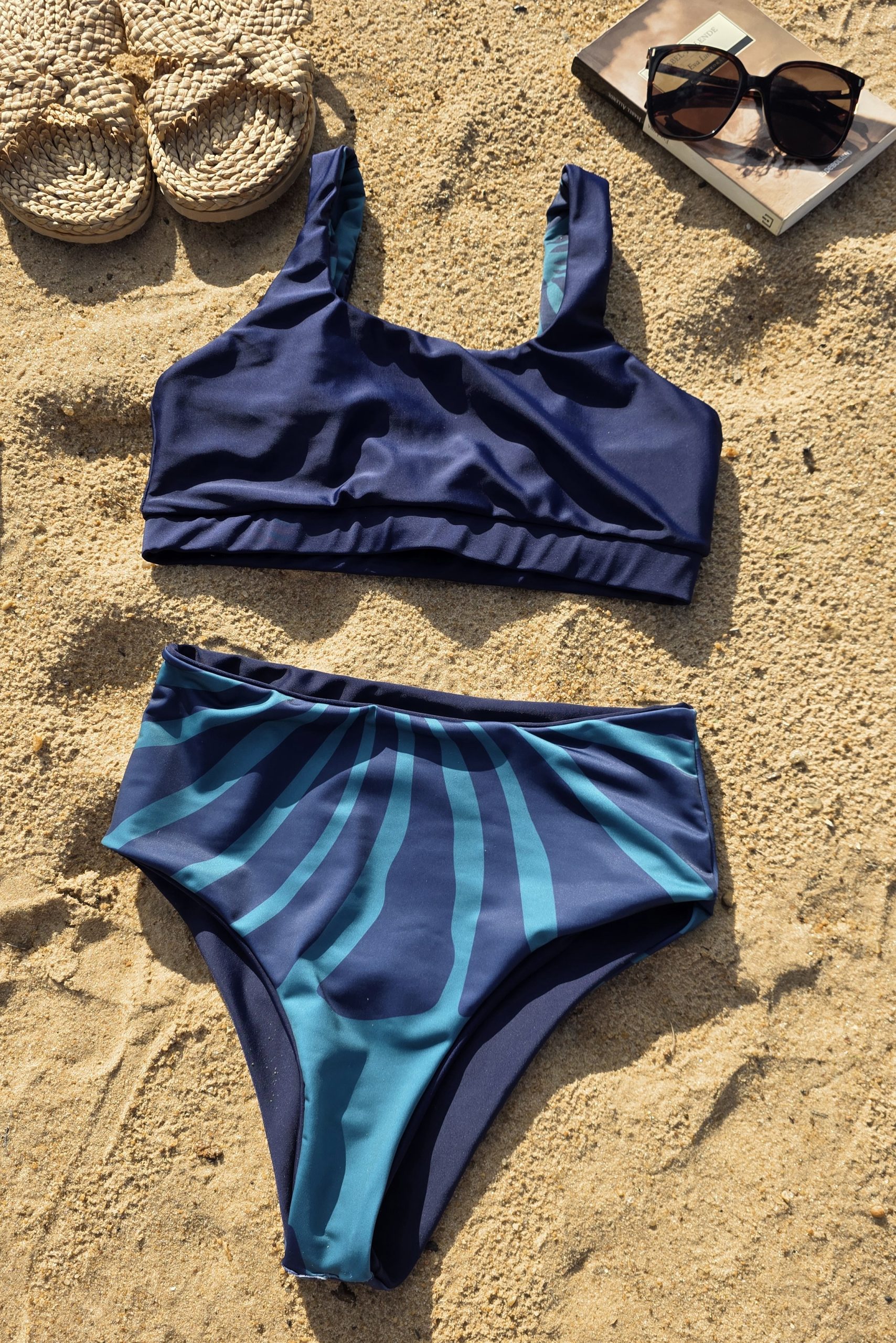 Bombacha tiro alto (al ombligo) reversible. Corte tipo Culotte. Super cómoda, sostiene muy bien al ser alta y con doble lycra. Se puede doblar la cintura y queda con tiro medio. Se puede usar más o menos cavada y alta. Una de las prendas favoritas – Estampa de caracolas en azul y verde combinada/reversible con azul marino