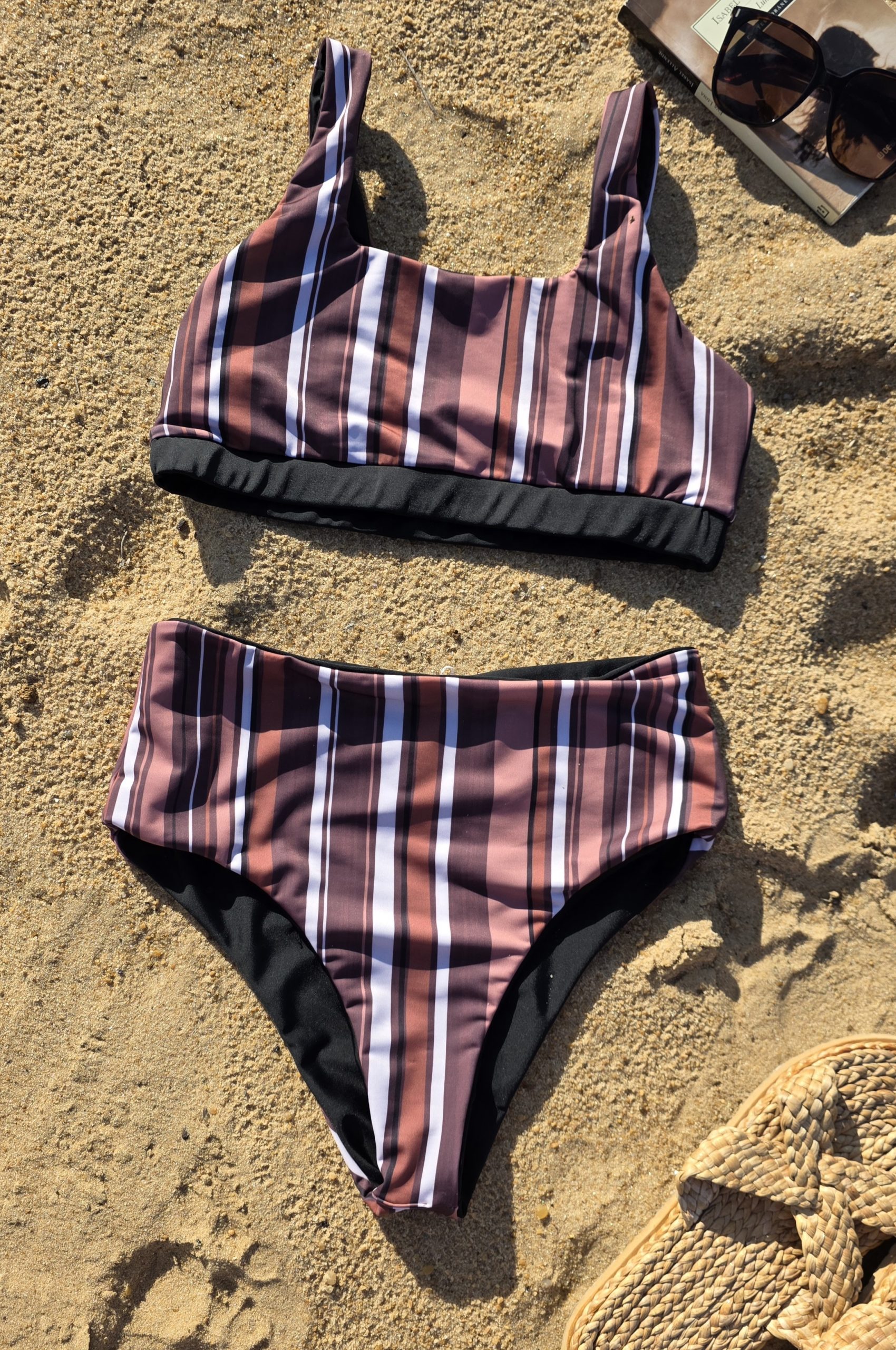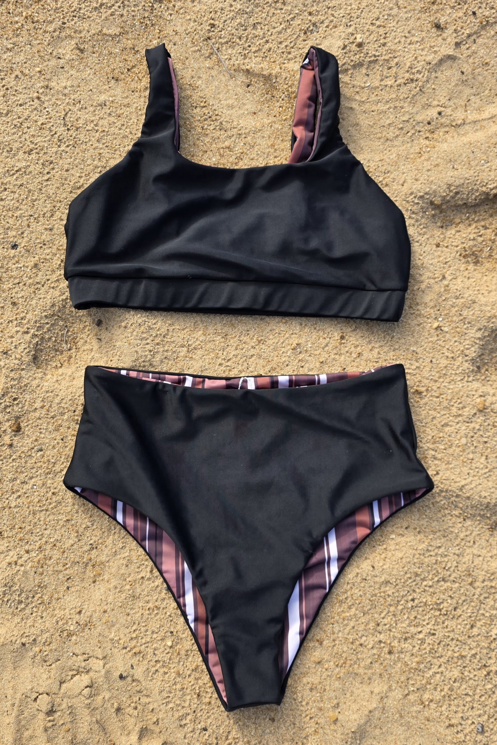 Bombacha tiro alto (al ombligo) reversible. Corte tipo Culotte. Super cómoda, sostiene muy bien al ser alta y con doble lycra. Se puede doblar la cintura y queda con tiro medio. Se puede usar más o menos cavada y alta. Una de las prendas favoritas – Estampa rayada en tonos tostados y negro, combinada/reversible con negro
